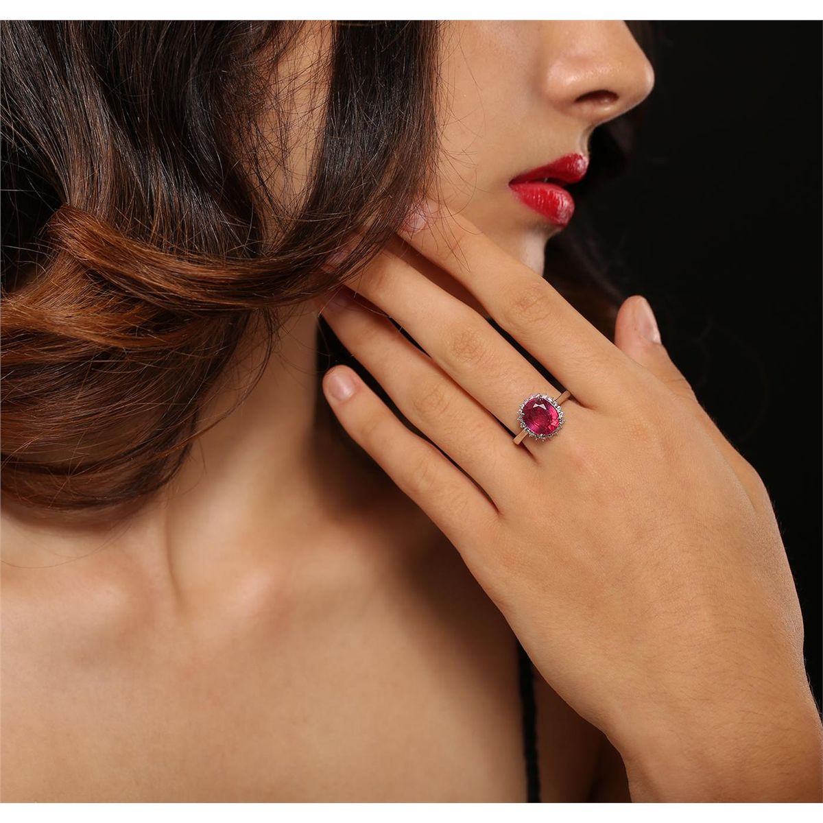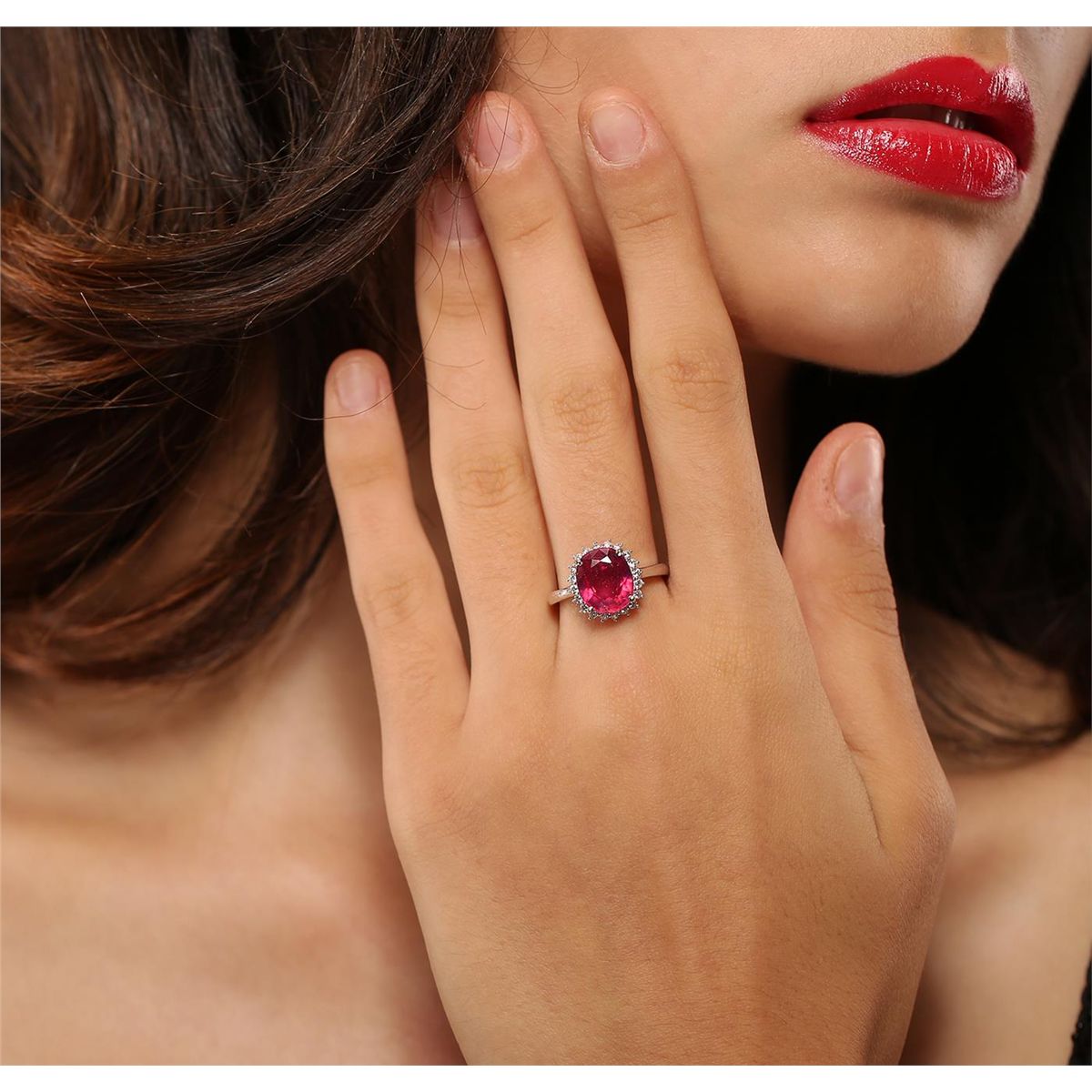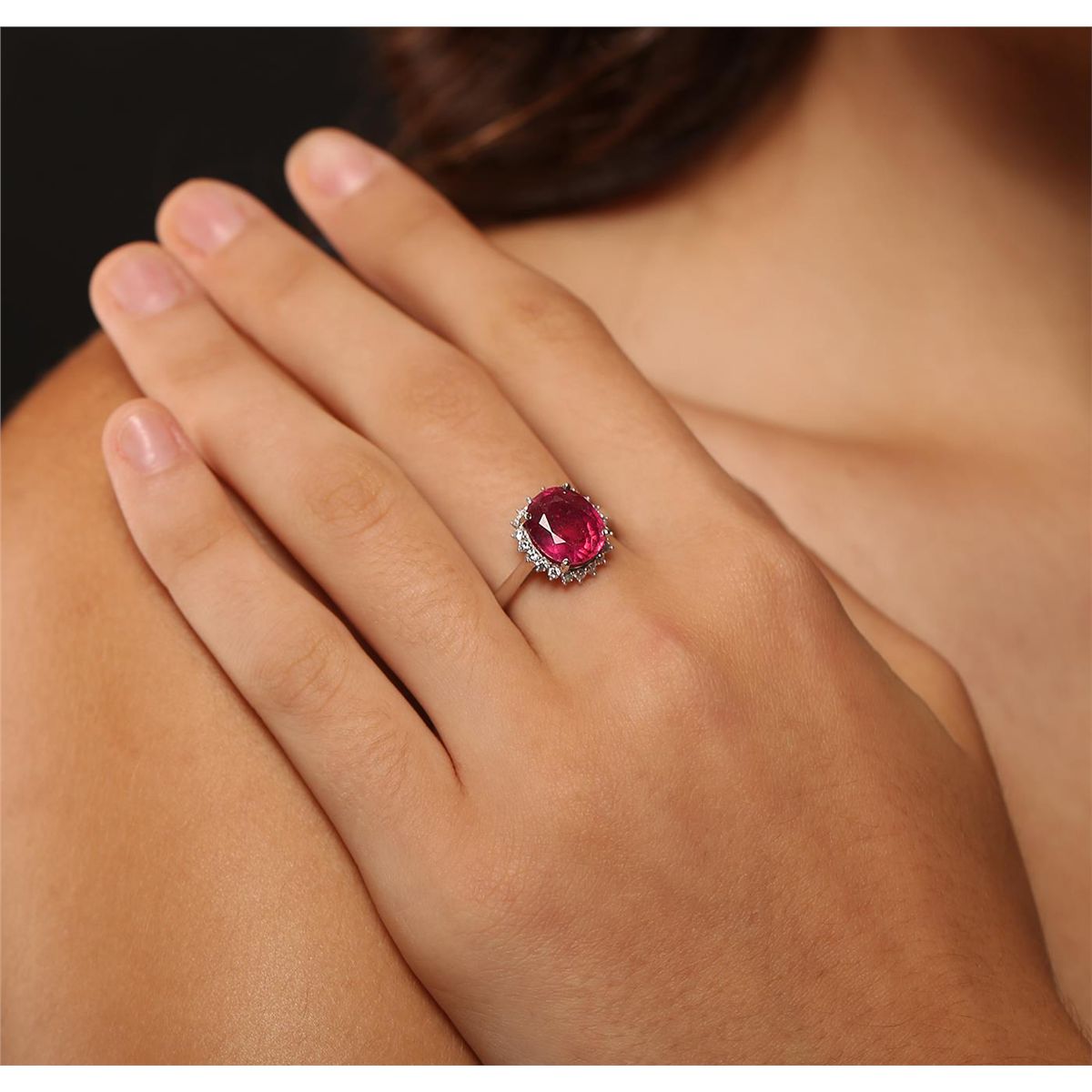 14KT white gold 3.73ct Ruby and Diamond Ring A6567. One electronically tested 14KT white gold ladies cast ruby and diamond ring with a bright polish finish. The featured ruby is set within a diamond bezel supported by tapering shoulders, completed by a two and one-half millimeter wide band. Trademark is Orianne. Identified with markings of "14K". Condition is new, good workmanship. Containing: One prong set oval mixed cut natural ruby, measuring 10.70 x 8.70 x 5.65mm, approximate weight of 3.73ct., clarity is heavily included, type II, medium dark, moderately strong, red color, (GIA R 6/4), cut is good. Transmitting light somewhat diffusely, transparent to translucent. Naturally occurring internal & external characteristics are present. Indications of laboratory high temperature heat treatment, with glass & flux additives. Graded in the setting. Ruby has a low tolerance to rhodium plating, repolishing the surface, & ultrasonic cleaning.Twenty prong set round brilliant cut diamonds, measuring 1.70 - 1.60 x 0.99mm (depth est.) approximate. Total Weight of 20 Stones = 0.34ct. Graded in the setting. Clarity: SI-1 to I-1. Color: F - H. Total Weight of Colored Stones 3.73ct. Total Weight of Diamonds 0.34ct. AIG Appraised at $2,830.00.