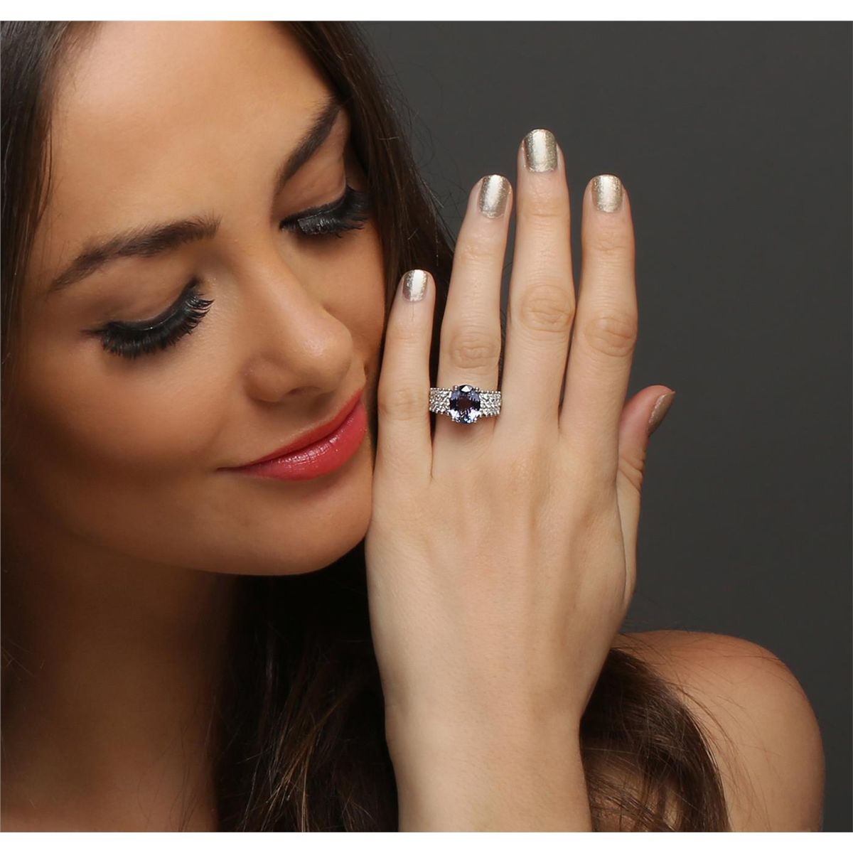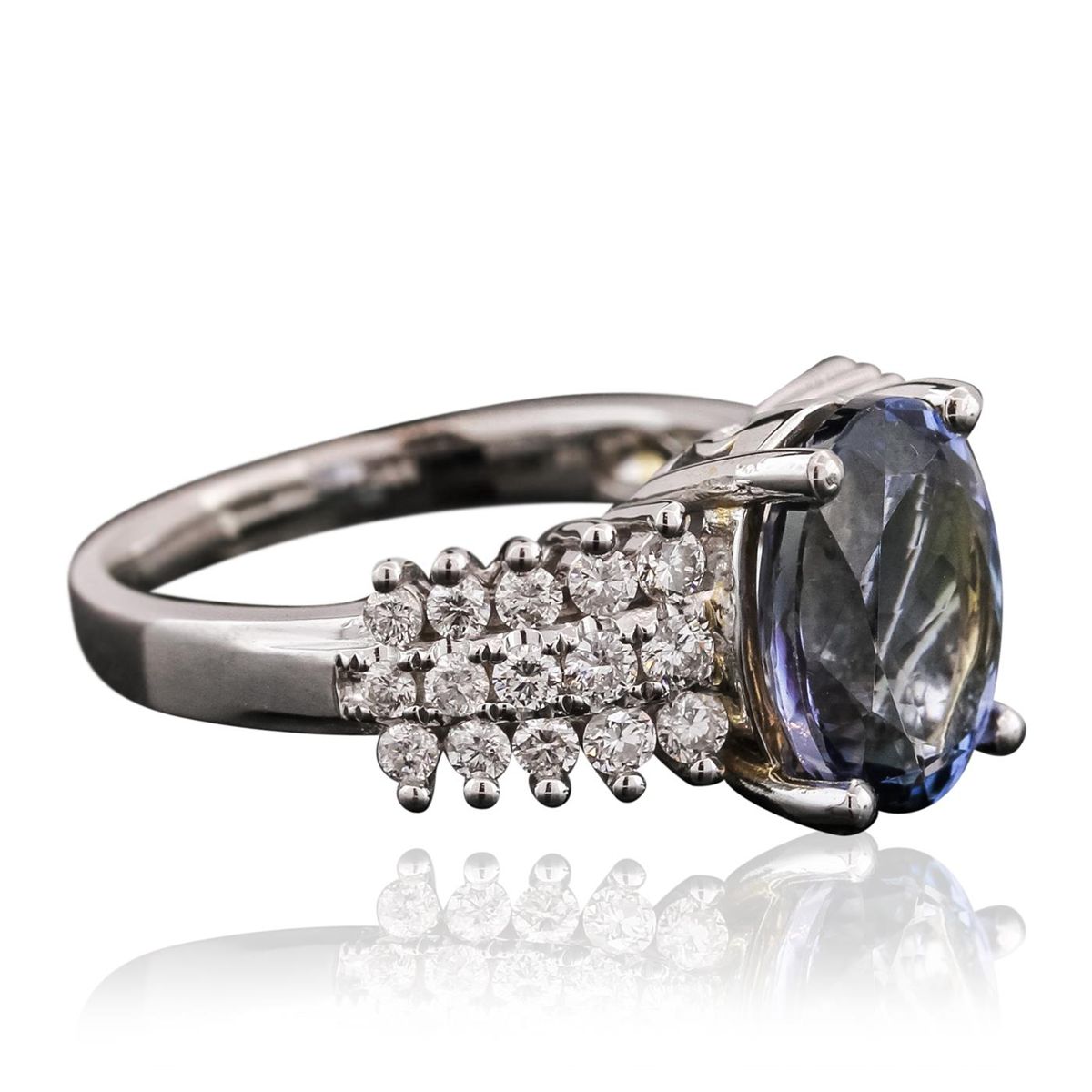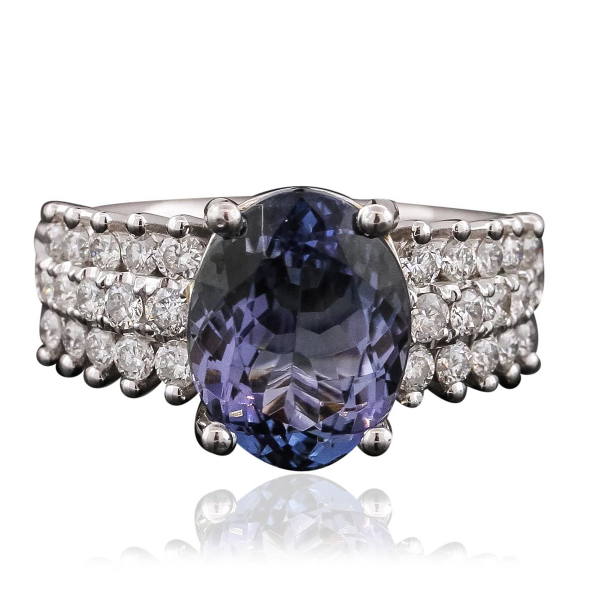 One electronically tested 14KT white gold ladies combination cast & assembled tanzanite and diamond ring with a tapered shank with a bright polish finish. Identified with markings of "14K". Condition is new. Containing: One prong set oval modified brilliant cut natural tanzanite, measuring 11.76 x 8.73 x 5.30mm, approximate weight of 3.73ct., clarity is eye clean, type I, medium light, very slightly grayish, violet color, (GIA V 4/3), cut is good. Thirty prong set round brilliant cut diamonds, measuring 1.60 - 1.60 x 0.96mm (depth est.) approximate total weight of 30 Stones = 0.45ct. Clarity: SI-2 to I-2. Color: H - I, Cut is Good. Colored gemstones are presumed to have been subjected to commonly used enhancement processes. All diamonds and colored gemstones are graded in the mounting, unless otherwise stated. Total Weight of Colored Stones 3.73ct. Total Weight of Diamonds 0.45ct. Total Weight of Ring 5.70 grams. GGL Appraised at $7,860.00.