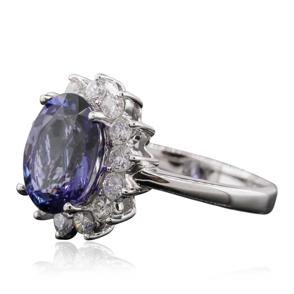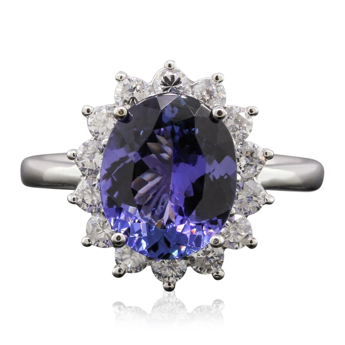 One electronically tested 14KT white gold Ladies combination cast & assembled ring with a bright polish finish. Condition is new. Identified with markings of "14K". Containing: One prong set oval modified brilliant cut natural tanzanite, measuring 10.70 x 8.90 x 5.79mm, approximate weight of 3.73ct., clarity is eye clean, type I, medium, very slightly grayish, bluish violet color, (GIA bV 5/3), cut is good. Colored gemstones are presumed to have been subjected to commonly used color/clarity enhancement processes. Fourteen prong set round brilliant cut diamonds, measuring 2.20 - 2.20 x 1.32mm (depth est.) approximate. Total Weight of 14 Stones = 0.55ct. . Clarity: SI-1 to SI-2. Color: I - J, Cut is Good. . Total Weight of Colored Stones 3.73ct. Total Weight of Diamonds 0.55ct. Total Weight of Ring 4.70 grams. GGL Appraised at $8,210.00.