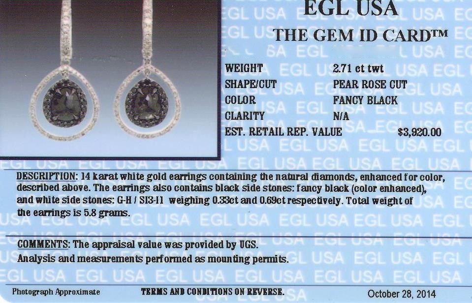 One pair of 14KT white gold earrings containing two natural pear rose cut fancy black diamonds, enhanced for color, with a total weight of 2.71ct. The earrings also contain black side stones: fancy black (color enhanced), and white side stone: G-H / SI3-I1 weighing 0.33ct and 0.69ct respectively. Total weight of the earrings is 5.80 grams. EGL Appraised at $3,920.00.