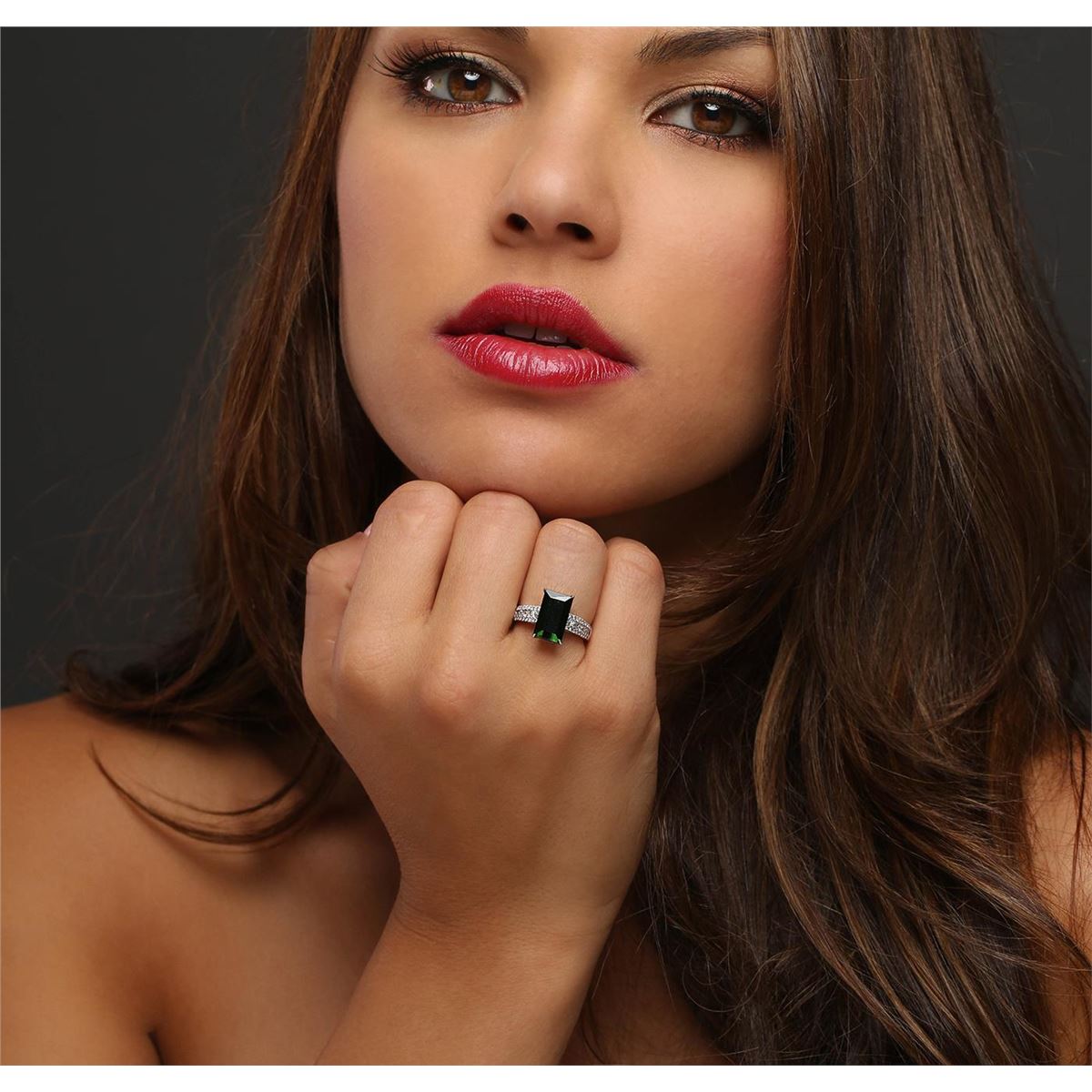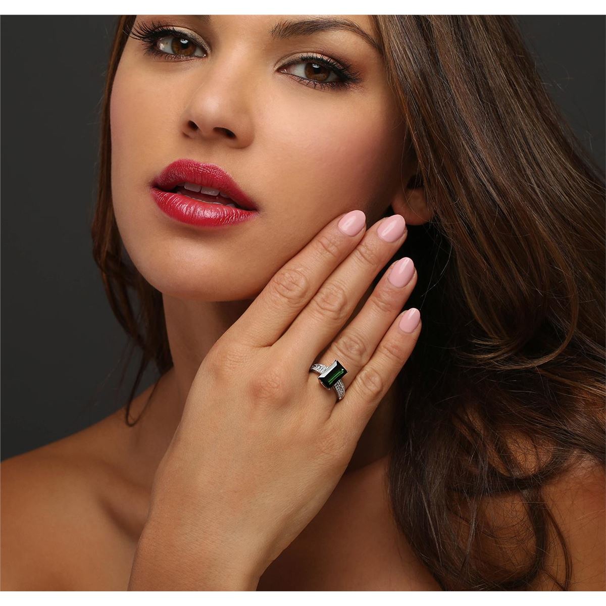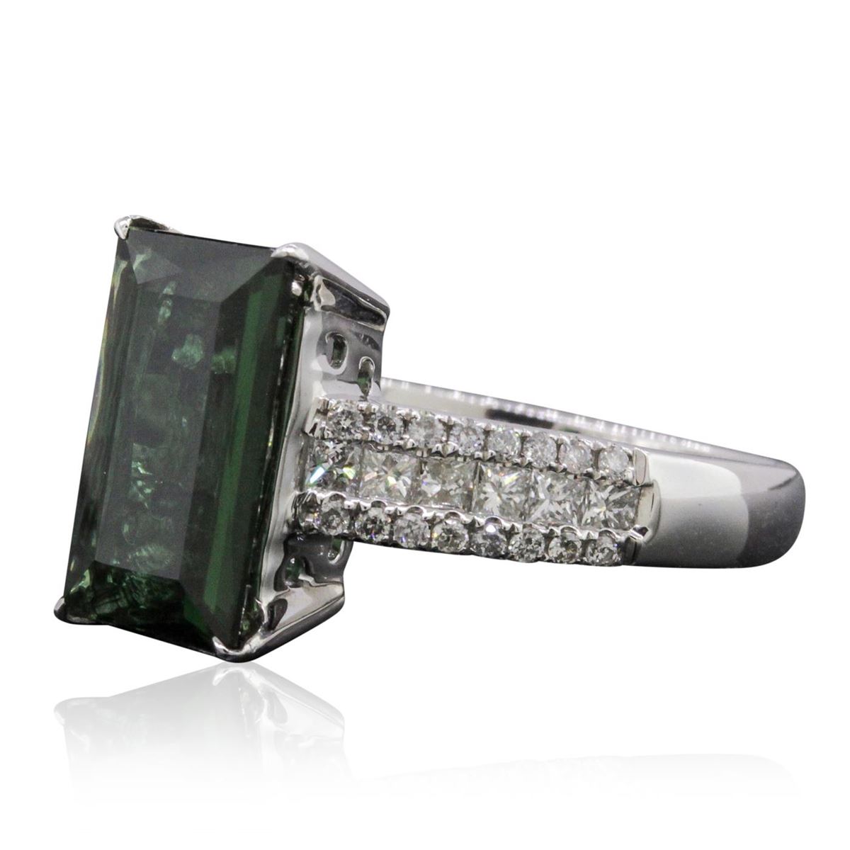 One ring featuring: 14KT white gold weighing 4.41 grams containing one green tourmaline with a total weight of 3.75ct, 12 princess cut diamonds with a total weight of 0.45cts, and 32 round cut diamonds with a total weight of 0.19cts.