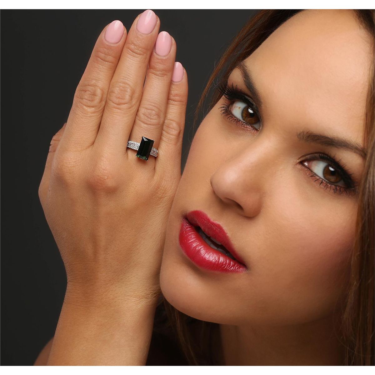 One ring featuring: 14KT white gold weighing 4.41 grams containing one green tourmaline with a total weight of 3.75ct, 12 princess cut diamonds with a total weight of 0.45cts, and 32 round cut diamonds with a total weight of 0.19cts.