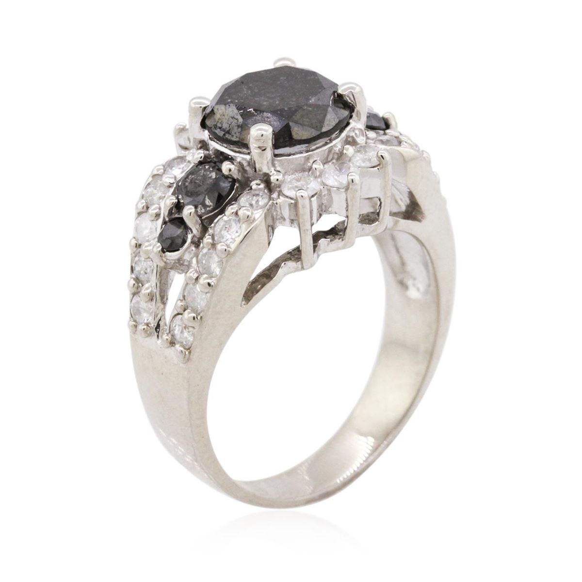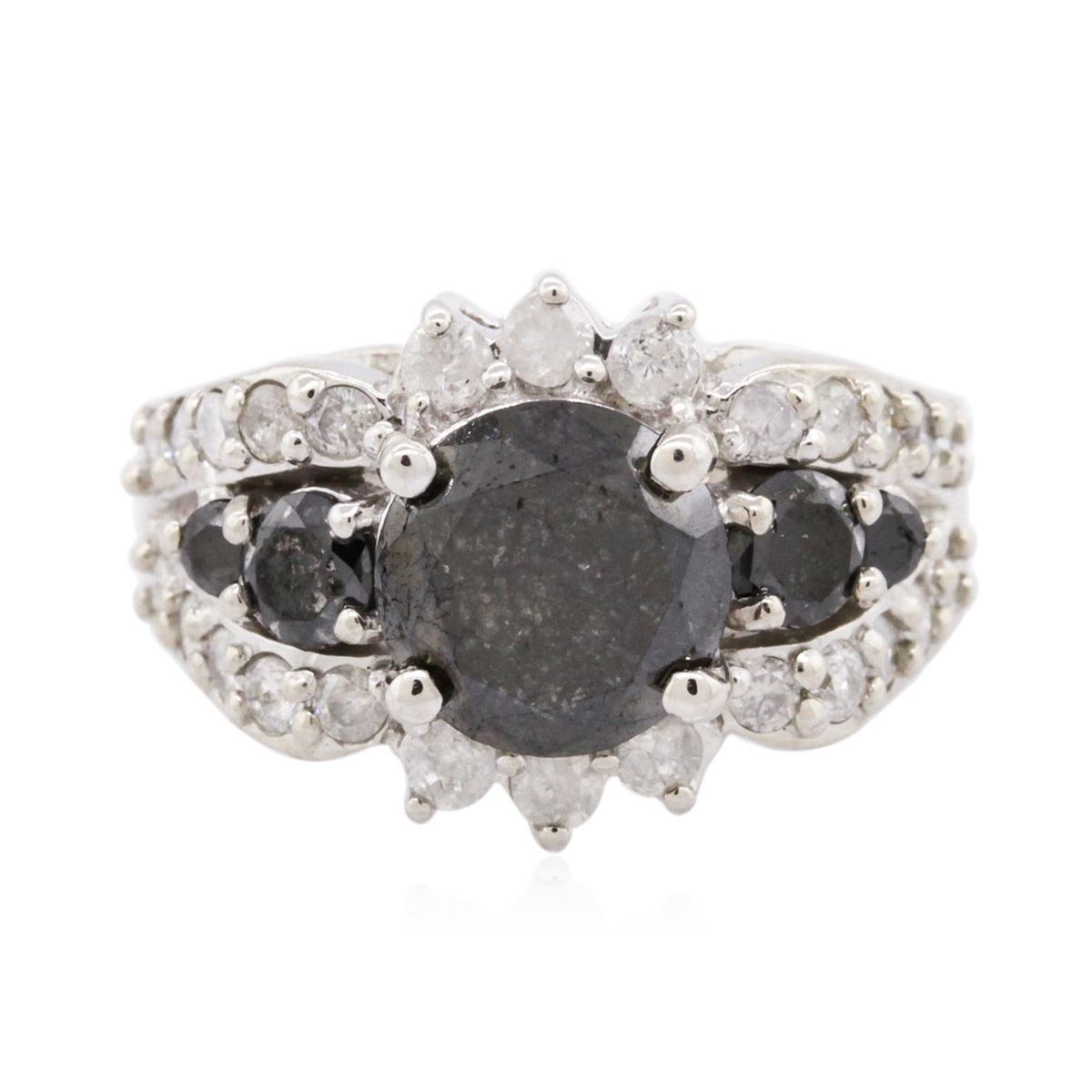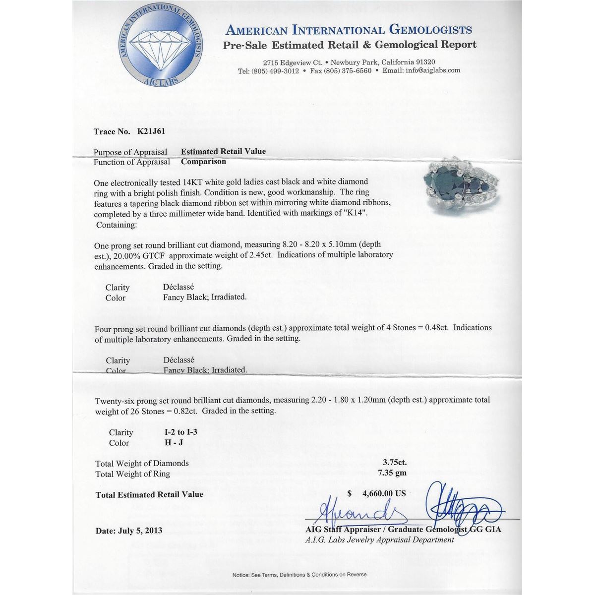 One electronically tested 14KT white gold ladies cast black and white diamond ring with a bright polish finish. Condition is new, good workmanship. The ring features a tapering black diamond ribbon set within mirroring white diamond ribbons, completed by a three millimeter wide band. Identified with markings of K14. Containing: One prong set round brilliant cut diamond, measuring 8.20 - 8.20 x 5.10mm (depth est.), 20.00% GTCF approximate weight of 2.45ct. Indications of multiple laboratory enhancements. Graded in the setting. Clarity: Declasse. Color: Fancy Black; Irradiated. Four prong set round brilliant cut diamonds (depth est.) approximate total weight of 4 stones = 0.48ct. Indications of multiple laboratory enhancements. Graded in the setting. Clarity: Declasse. Color: Fancy Black; Irradiated. Twenty-six prong set round brilliant cut diamonds, measuring 2.20 - 1.80 x 1.20mm (depth est.) approximate total weight of 26 stones = 0.82ct. Graded in the setting. Clarity: I-2 to I-3. Color: H-J. Total Weight of Diamonds 3.75ct. Total Weight of Ring 7.35 grams. AIG Appraised at $4,660.00.