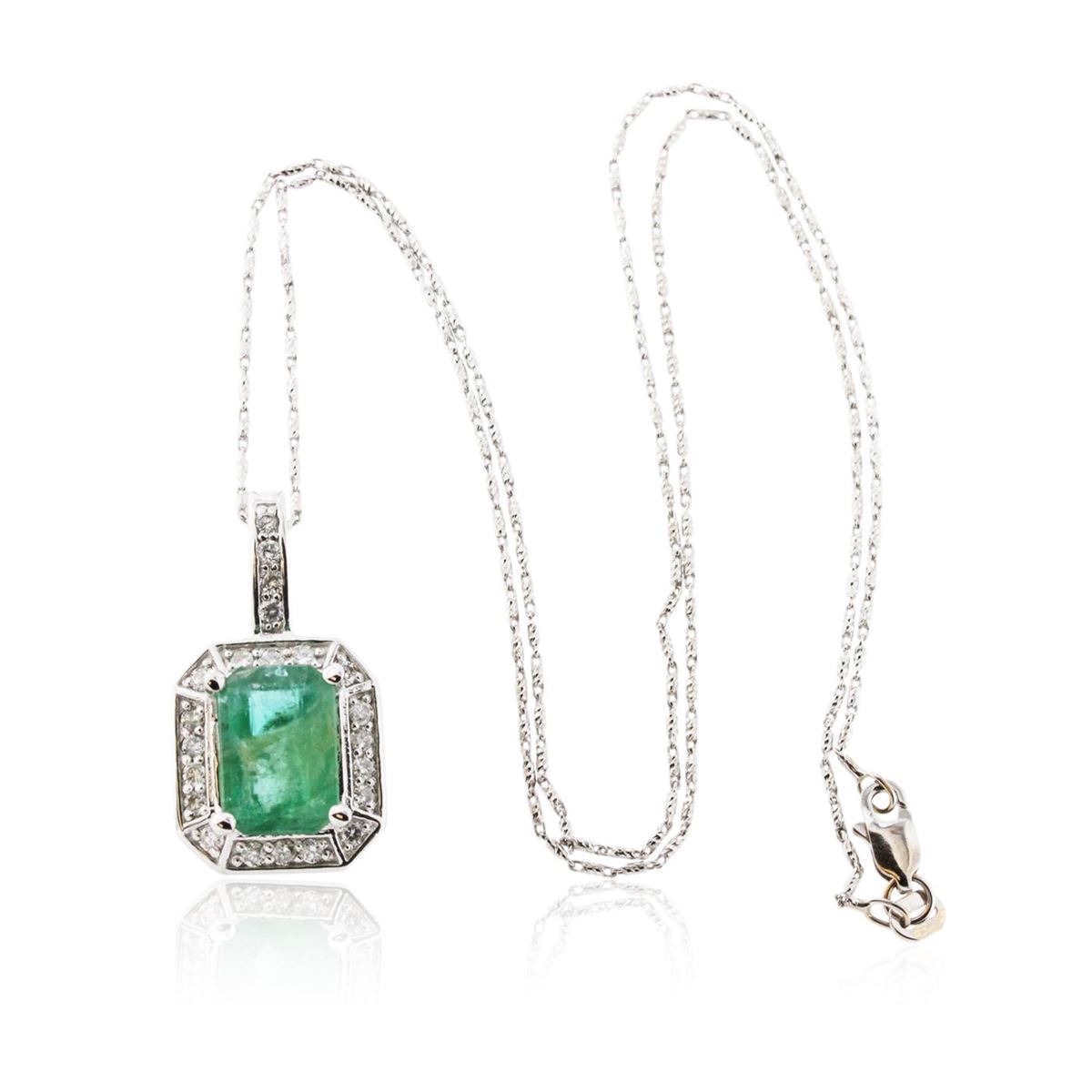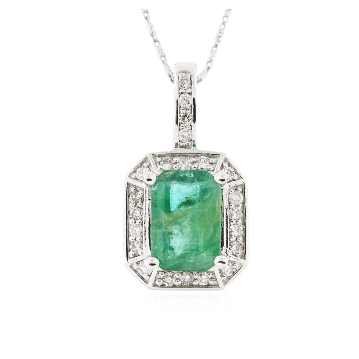 One electronically tested 14KT white gold ladies cast & assembled emerald and diamond pendant with chain. Condition is new, good workmanship. The pendant features an emerald set within a diamond bezel, supported by a diamond set bail. The pendant is supported by an eighteen inch length 14KT white gold designer style chain terminating in a lobster claw clasp. Bright polish finish. Containing: One prong set rectangular step cut natural emerald, measuring 11.60 x 8.00 x 4.60mm, 8%. bulge factor, approximate weight of 3.76ct., clarity is heavily included, type III, medium, very slightly grayish, very slightly bluish green color, (GIA vslbG 5/3), cut is good. Transmitting light with a minimum of distortion, transparent to translucent. Naturally occurring internal & external characteristics are present. Indications of oil residue. Graded in the setting. Twenty-Two bead set round brilliant cut diamonds, measuring 1.80 - 1.80 x 1.08mm (depth est.) approximate. Total Weight of 22 Stones = 0.56ct. Graded in the setting. Clarity: I-1 to I-2. Color: F - H. Total Weight of Colored Stones 3.76ct. Total Weight of Diamonds 0.56ct. Total Weight of Pendant With Chain 8.90 grams. AIG Appraised at $5,570.00.