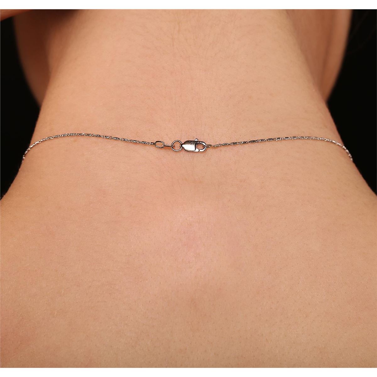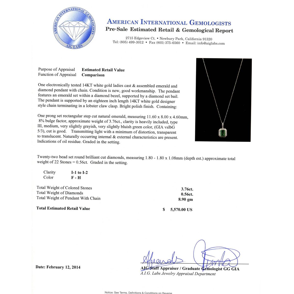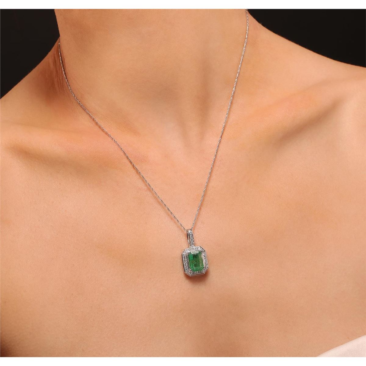 One electronically tested 14KT white gold ladies cast & assembled emerald and diamond pendant with chain. Condition is new, good workmanship. The pendant features an emerald set within a diamond bezel, supported by a diamond set bail. The pendant is supported by an eighteen inch length 14KT white gold designer style chain terminating in a lobster claw clasp. Bright polish finish. Containing: One prong set rectangular step cut natural emerald, measuring 11.60 x 8.00 x 4.60mm, 8%. bulge factor, approximate weight of 3.76ct., clarity is heavily included, type III, medium, very slightly grayish, very slightly bluish green color, (GIA vslbG 5/3), cut is good. Transmitting light with a minimum of distortion, transparent to translucent. Naturally occurring internal & external characteristics are present. Indications of oil residue. Graded in the setting. Twenty-Two bead set round brilliant cut diamonds, measuring 1.80 - 1.80 x 1.08mm (depth est.) approximate. Total Weight of 22 Stones = 0.56ct. Graded in the setting. Clarity: I-1 to I-2. Color: F - H. Total Weight of Colored Stones 3.76ct. Total Weight of Diamonds 0.56ct. Total Weight of Pendant With Chain 8.90 grams. AIG Appraised at $5,570.00.