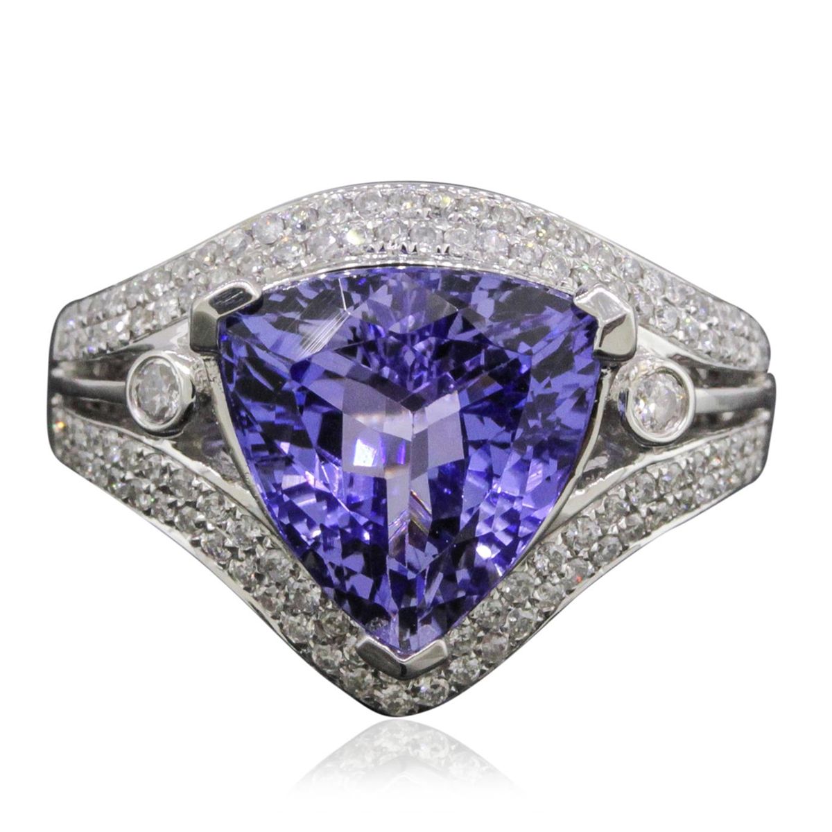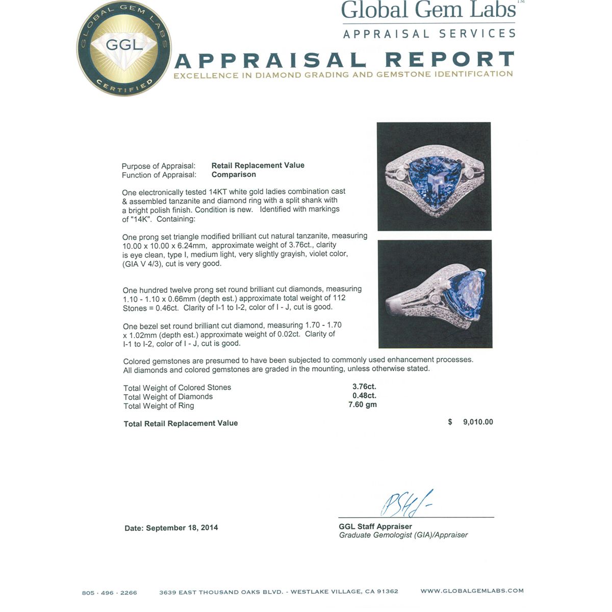 One electronically tested 14KT white gold ladies combination cast & assembled tanzanite and diamond ring with a split shank with a bright polish finish. Identified with markings of "14K". Condition is new. Containing: One prong set triangle modified brilliant cut natural tanzanite, measuring 10.00 x 10.00 x 6.24mm, approximate weight of 3.76ct., clarity is eye clean, type I, medium light, very slightly grayish, violet color, (GIA V 4/3), cut is very good. One Hundred Twelve prong set round brilliant cut diamonds, measuring 1.10 - 1.10 x 0.66mm (depth est.) approximate total weight of 112 Stones = 0.46ct. Clarity: I-1 to I-2. Color: I - J, Cut is Good. One bezel set round brilliant cut diamond, measuring 1.70 - 1.70 x 1.02mm (depth est.) approximate weight of 0.02ct. Clarity: I-1 to I-2. Color: I - J, Cut is Good. Colored gemstones are presumed to have been subjected to commonly used enhancement processes. All diamonds and colored gemstones are graded in the mounting, unless otherwise stated. Total Weight of Colored Stones 3.76ct. Total Weight of Diamonds 0.48ct. Total Weight of Ring 7.60 grams. GGL Appraised at $9,010.00.