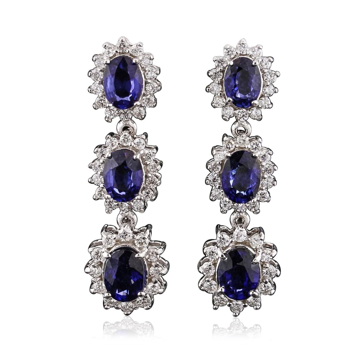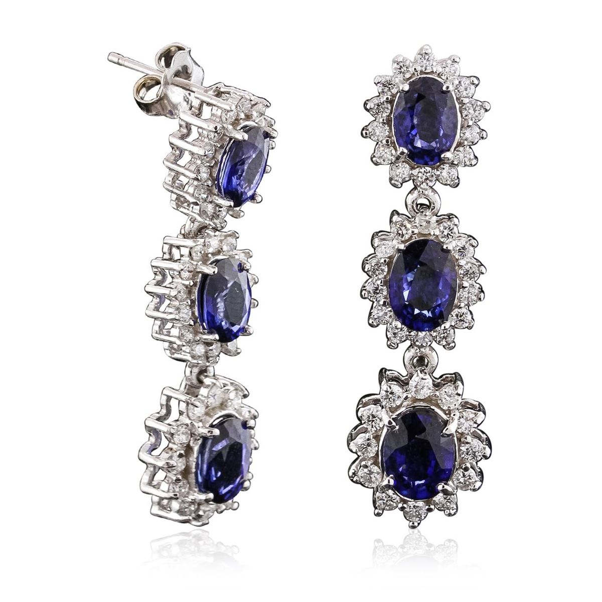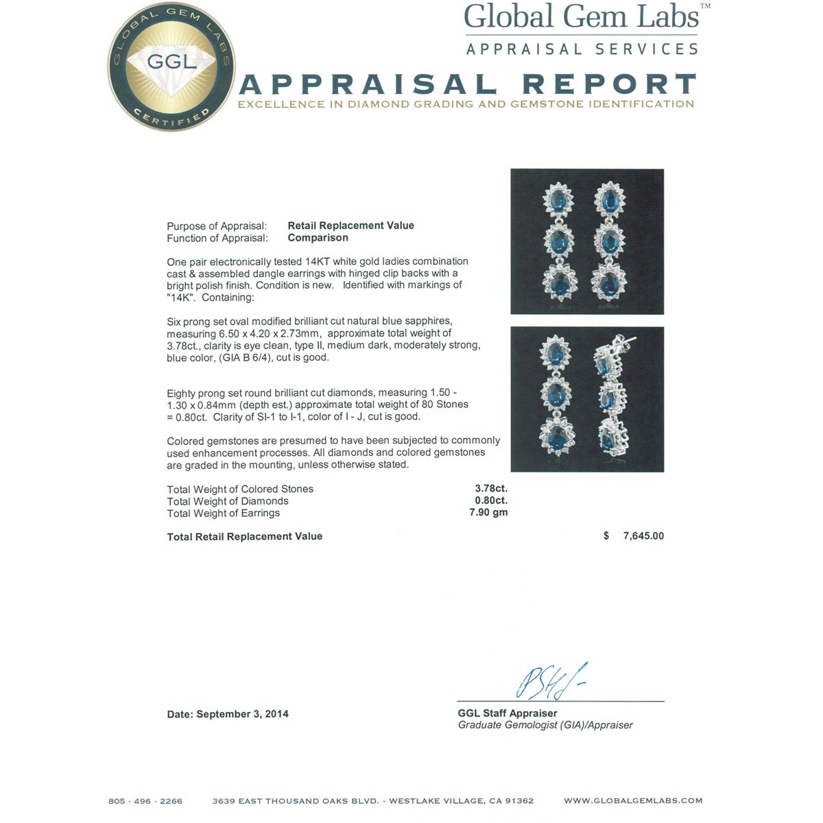 One pair electronically tested 14KT white gold ladies combination cast & assembled dangle earrings with hinged clip backs with a bright polish finish. Identified with markings of "14K". Condition is new. Containing: Six prong set oval modified brilliant cut natural blue sapphires, measuring 6.50 x 4.20 x 2.73mm, approximate total weight of 3.78ct., clarity is eye clean, type II, medium dark, moderately strong, blue color, (GIA B 6/4), cut is good. Eighty prong set round brilliant cut diamonds, measuring 1.50 - 1.30 x 0.84mm (depth est.) approximate total weight of 80 Stones = 0.80ct. Clarity: SI-1 to I-1. Color: I - J, Cut is Good. Colored gemstones are presumed to have been subjected to commonly used enhancement processes. All diamonds and colored gemstones are graded in the mounting, unless otherwise stated. Total Weight of Colored Stones 3.78ct. Total Weight of Diamonds 0.80ct. Total Weight of Earrings 7.90 grams. GGL Appraised at $7,645.00.