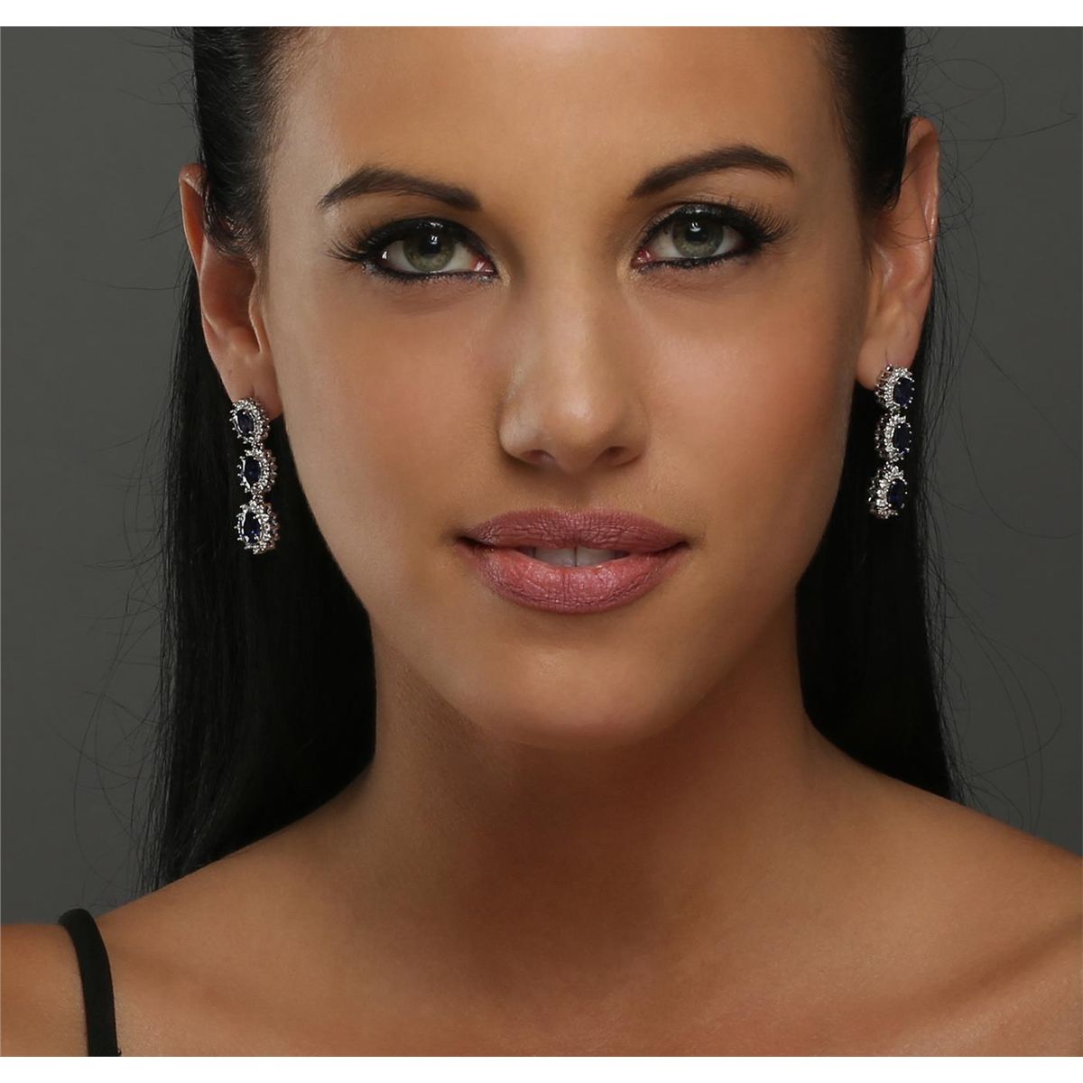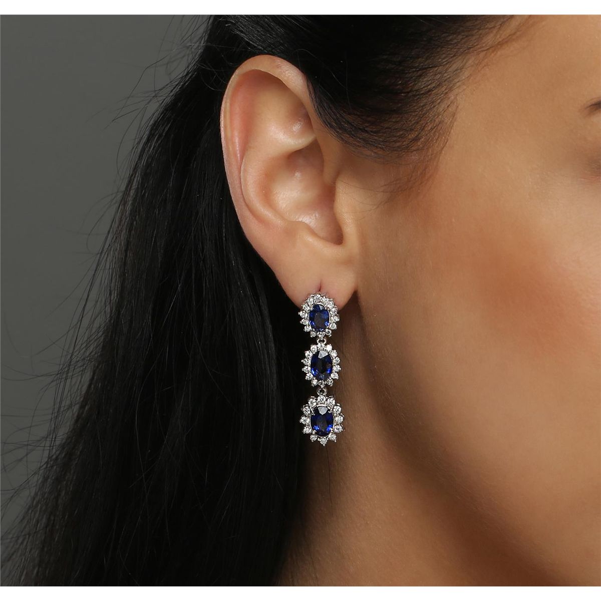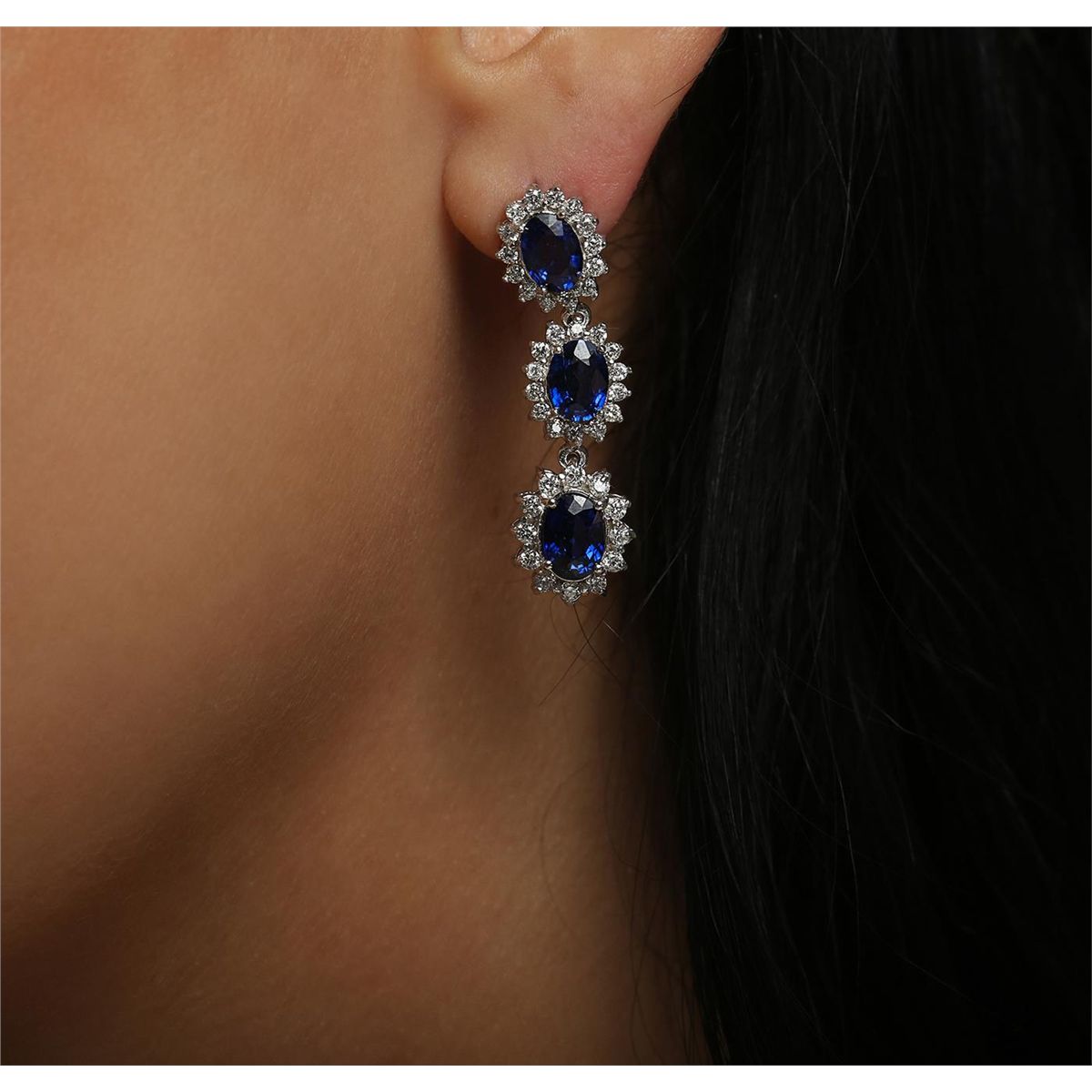 One pair electronically tested 14KT white gold ladies combination cast & assembled dangle earrings with hinged clip backs with a bright polish finish. Identified with markings of "14K". Condition is new. Containing: Six prong set oval modified brilliant cut natural blue sapphires, measuring 6.50 x 4.20 x 2.73mm, approximate total weight of 3.78ct., clarity is eye clean, type II, medium dark, moderately strong, blue color, (GIA B 6/4), cut is good. Eighty prong set round brilliant cut diamonds, measuring 1.50 - 1.30 x 0.84mm (depth est.) approximate total weight of 80 Stones = 0.80ct. Clarity: SI-1 to I-1. Color: I - J, Cut is Good. Colored gemstones are presumed to have been subjected to commonly used enhancement processes. All diamonds and colored gemstones are graded in the mounting, unless otherwise stated. Total Weight of Colored Stones 3.78ct. Total Weight of Diamonds 0.80ct. Total Weight of Earrings 7.90 grams. GGL Appraised at $7,645.00.