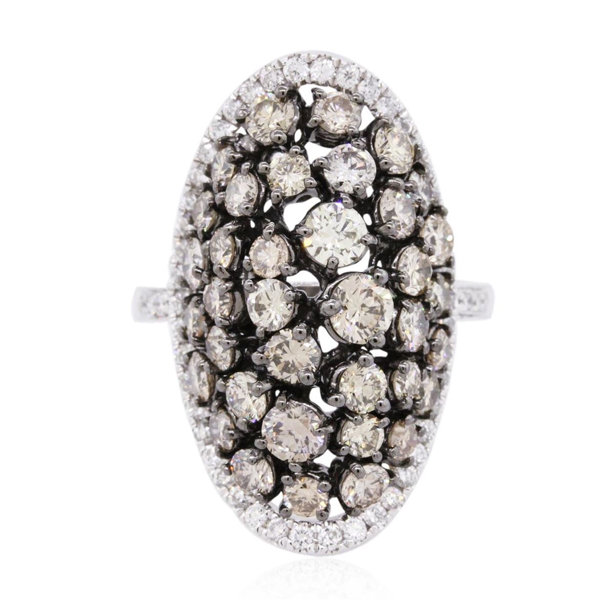 One electronically tested 14KT white gold ladies cast diamond ring with a bright polish finish. Identified with markings of "14K". Condition is new. Containing: Fifty-Two prong set round brilliant cut diamonds, measuring 1.20 - 1.20 x 0.72mm (depth est.) approximate total weight of 52 Stones = 0.33ct. Clarity: SI-2 to I-1. Color: I - J, Cut is Good. Thirty-Five prong set round brilliant cut diamonds, measuring 3.50 - 2.50 x 1.80mm (depth est.) approximate total weight of 35 Stones = 3.46ct. Clarity: SI-1, Cut is Good. All diamonds are graded in the mounting, unless otherwise stated. Total Weight of Diamonds 3.79ct. Total Weight of Ring 7.50 grams. GGL Appraised at $7,660.00.