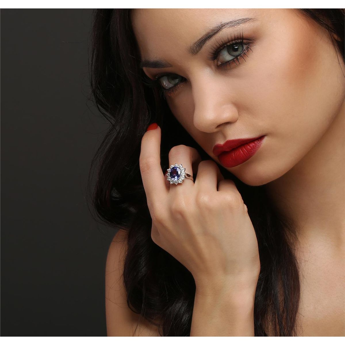 One electronically tested 14KT white gold ladies combination cast & assembled tanzanite and diamond ring with a flat shank with a bright polish finish. Identified with markings of "14K". Condition is new. Containing: One prong set oval modified brilliant cut natural tanzanite, measuring 11.08 x 9.01 x 5.62mm, approximate weight of 3.80ct., clarity is eye clean, type I, medium, moderately strong, violet color, (GIA V 5/4), cut is good. Twelve prong set round brilliant cut diamonds, measuring 3.20 - 3.20 x 1.92mm (depth est.) approximate total weight of 12 Stones = 1.44ct. Clarity: SI-2 to I-1. Color: I - J, Cut is Good. Colored gemstones are presumed to have been subjected to commonly used enhancement processes. All diamonds and colored gemstones are graded in the mounting, unless otherwise stated. Total Weight of Colored Stones 3.80ct. Total Weight of Diamonds 1.44ct. Total Weight of Ring 5.70 grams. GGL Appraised at $10,365.00.