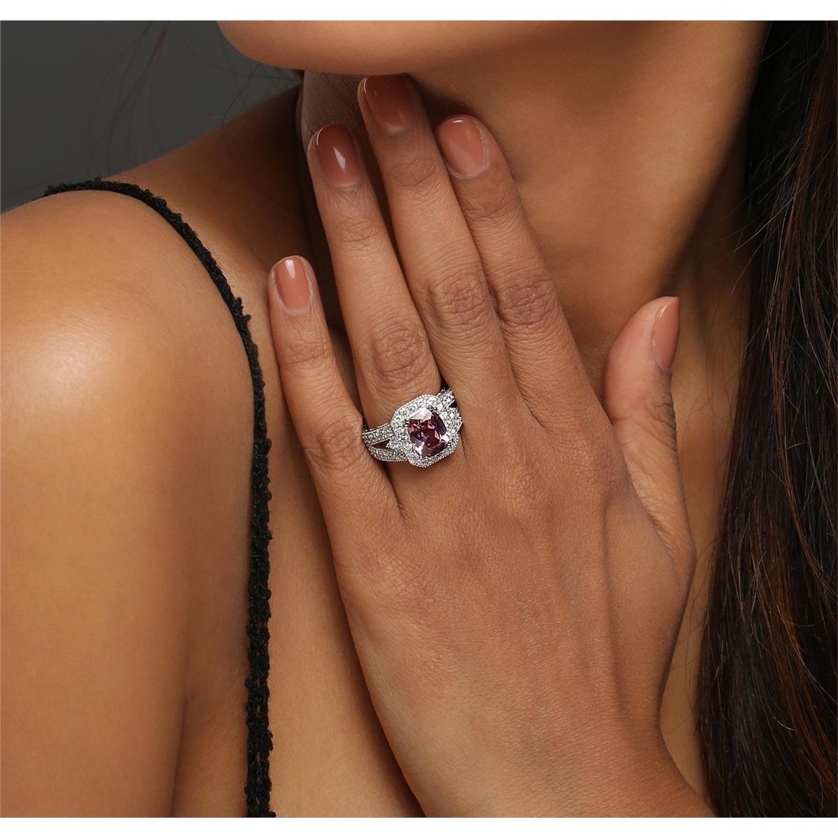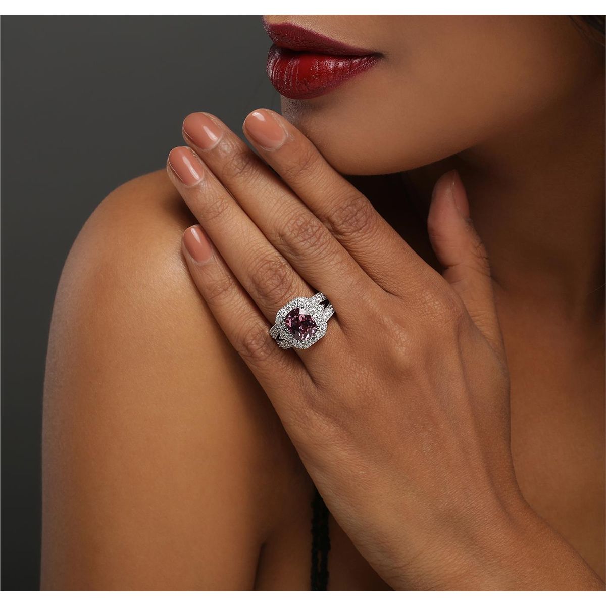 One electronically tested 14KT white gold ladies combination cast & assembled ring with a split shoulder shank with a bright polish finish. Identified with markings of "14K". Condition is new. Containing: One prong set rectangular cushion modified brilliant cut natural chrysoberyl, measuring 10.20 x 8.20 x 5.20mm, approximate weight of 3.81ct., clarity is eye clean, type I, medium light, slightly grayish, pink color, (GIA YG 4/2), cut is good. Forty prong set round brilliant cut diamonds, measuring 2.00 - 1.90 x 1.17mm (depth est.) approximate total weight of 40 Stones = 1.08ct. Clarity: SI-1 to SI-2. Color: H - I, Cut is Good. Colored gemstones are presumed to have been subjected to commonly used enhancement processes. All diamonds and colored gemstones are graded in the mounting, unless otherwise stated. Total Weight of Colored Stones 3.81ct. Total Weight of Diamonds 1.08ct. Total Weight of Ring 7.80 grams. GGL Appraised at $7,265.00.