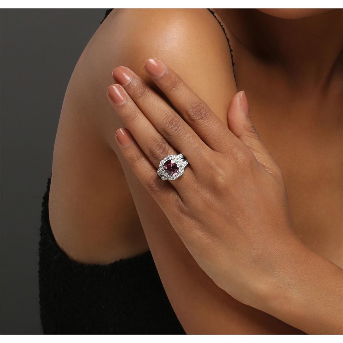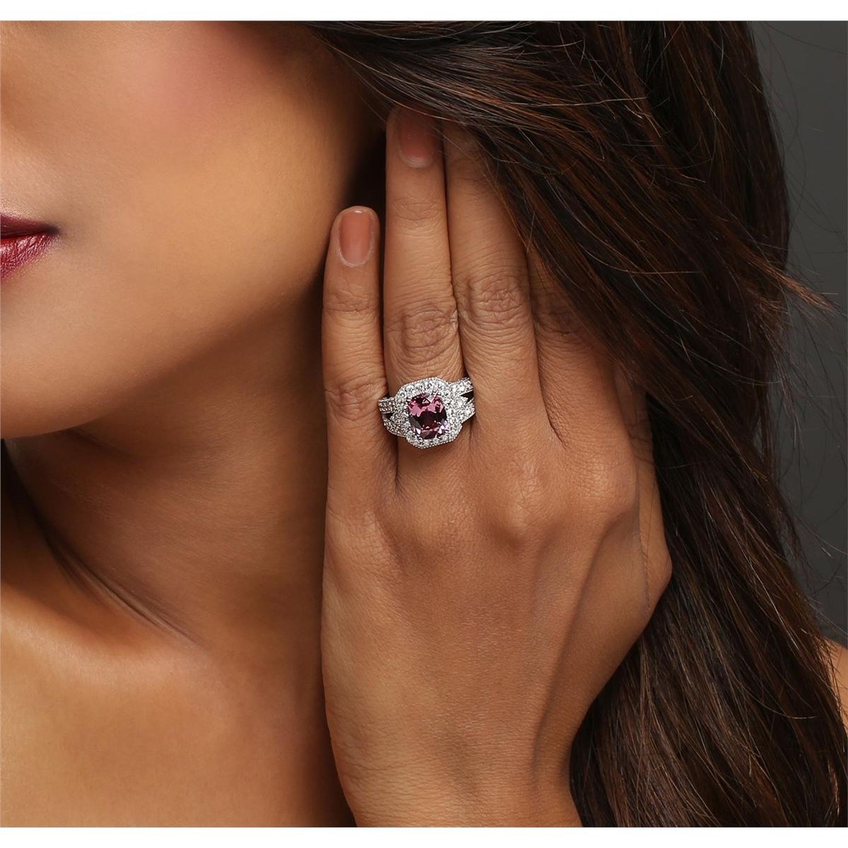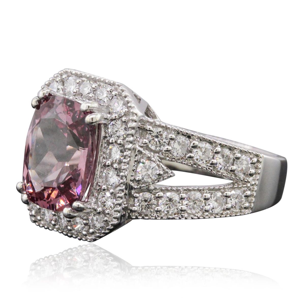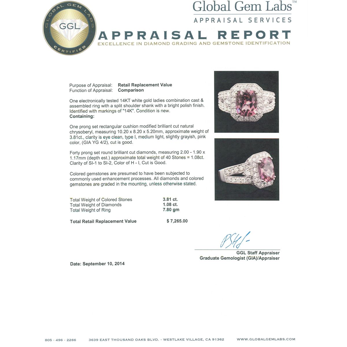 One electronically tested 14KT white gold ladies combination cast & assembled ring with a split shoulder shank with a bright polish finish. Identified with markings of "14K". Condition is new. Containing: One prong set rectangular cushion modified brilliant cut natural chrysoberyl, measuring 10.20 x 8.20 x 5.20mm, approximate weight of 3.81ct., clarity is eye clean, type I, medium light, slightly grayish, pink color, (GIA YG 4/2), cut is good. Forty prong set round brilliant cut diamonds, measuring 2.00 - 1.90 x 1.17mm (depth est.) approximate total weight of 40 Stones = 1.08ct. Clarity: SI-1 to SI-2. Color: H - I, Cut is Good. Colored gemstones are presumed to have been subjected to commonly used enhancement processes. All diamonds and colored gemstones are graded in the mounting, unless otherwise stated. Total Weight of Colored Stones 3.81ct. Total Weight of Diamonds 1.08ct. Total Weight of Ring 7.80 grams. GGL Appraised at $7,265.00.
