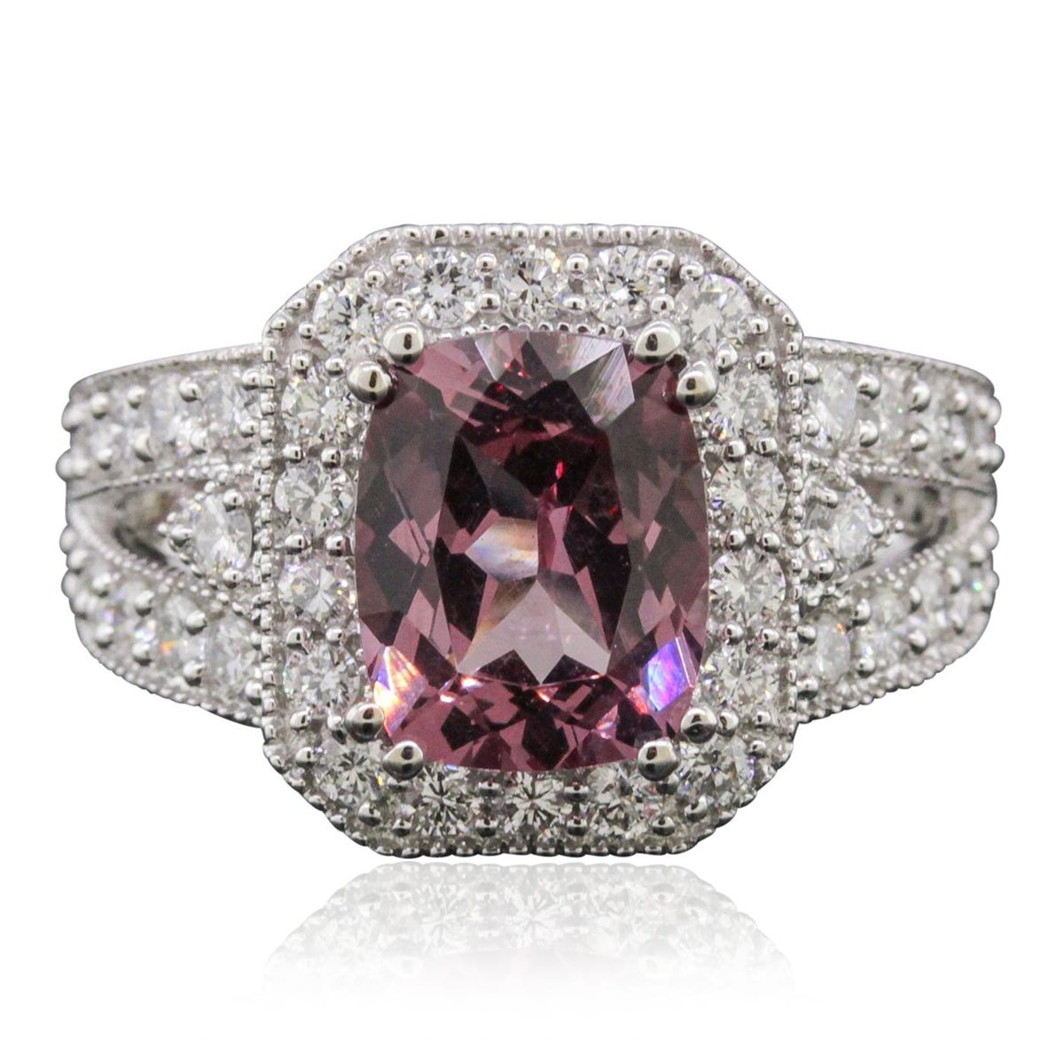 One electronically tested 14KT white gold ladies combination cast & assembled ring with a split shoulder shank with a bright polish finish. Identified with markings of "14K". Condition is new. Containing: One prong set rectangular cushion modified brilliant cut natural chrysoberyl, measuring 10.20 x 8.20 x 5.20mm, approximate weight of 3.81ct., clarity is eye clean, type I, medium light, slightly grayish, pink color, (GIA YG 4/2), cut is good. Forty prong set round brilliant cut diamonds, measuring 2.00 - 1.90 x 1.17mm (depth est.) approximate total weight of 40 Stones = 1.08ct. Clarity: SI-1 to SI-2. Color: H - I, Cut is Good. Colored gemstones are presumed to have been subjected to commonly used enhancement processes. All diamonds and colored gemstones are graded in the mounting, unless otherwise stated. Total Weight of Colored Stones 3.81ct. Total Weight of Diamonds 1.08ct. Total Weight of Ring 7.80 grams. GGL Appraised at $7,265.00.