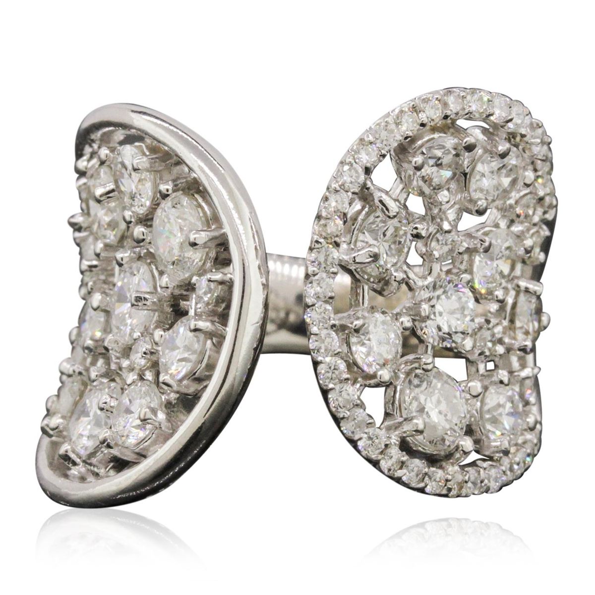 One electronically tested 14KT white gold ladies cast diamond ring with a bright polish finish. Condition is good. The ring features a stylized diamond set by-pass design, completed by a five millimeter wide band. Identified with markings of "14K". Containing: Five prong set round brilliant cut diamonds, measuring 4.10 - 4.00 x 2.43mm (depth est.) approximate. Total Weight of 5 Stones = 1.31ct. Graded in the setting. Clarity: SI-2 to I-1. Color: G - H Fifteen prong set round brilliant cut diamonds, measuring 3.30 - 3.00 x 1.89mm (depth est.) approximate. Total Weight of 15 Stones = 1.81ct. Graded in the setting. Clarity: SI-1 to I-1. Color: G - H Forty-Four prong set round brilliant cut diamonds, measuring 1.60 - 1.50 x 0.93mm (depth est.) approximate. Total Weight of 44 Stones = 0.69ct. Graded in the setting. Clarity: SI-1 to I-1. Color: G - H. Total Weight of Diamonds 3.81ct. Total Weight of Ring 10.28gm. AIG Appraised at $14,930.00.