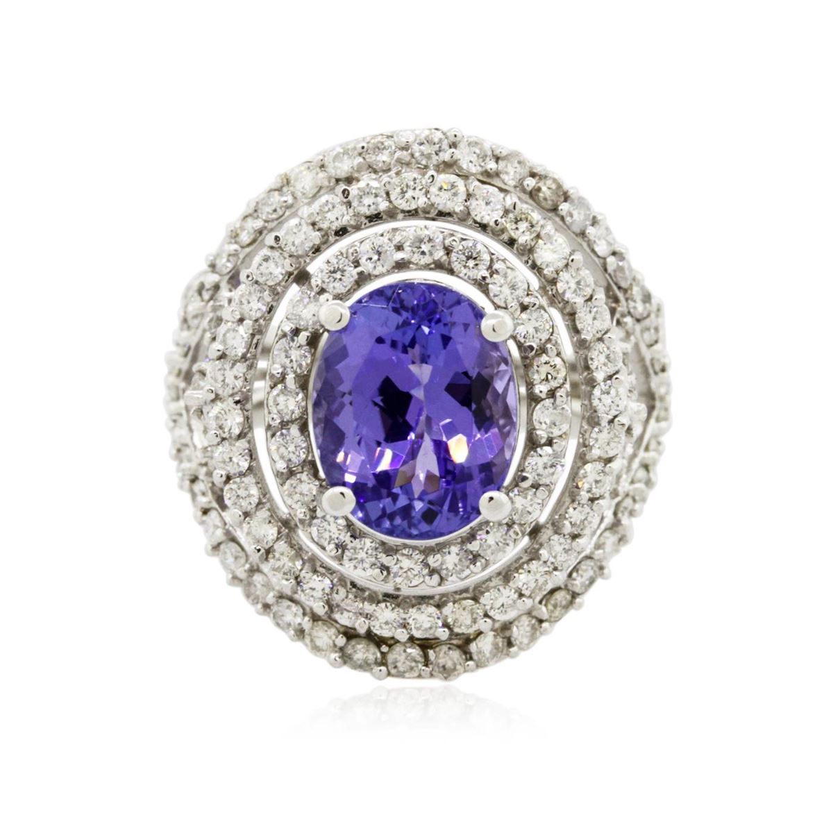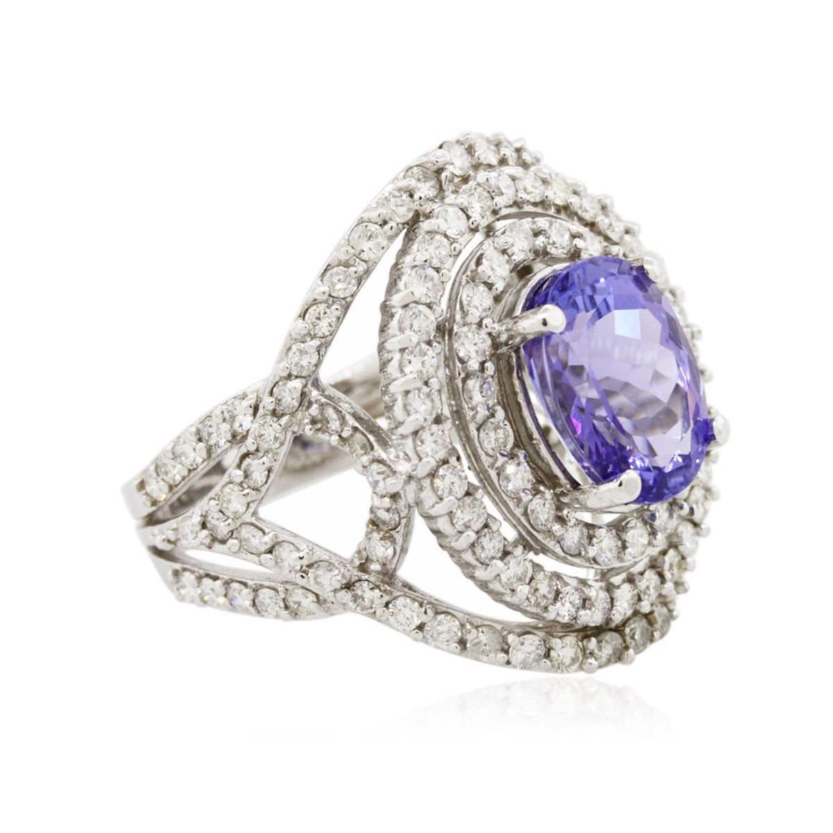 One electronically tested 14KT white gold Ladies combination cast & assembled ring with a bright polish finish. Condition is new. Identified with markings of "K14". Containing: One prong set oval modified brilliant cut natural tanzanite, measuring 10.90 x 8.80 x 5.87mm, approximate weight of 3.82ct., clarity is eye clean, type I, medium, moderately strong, bluish violet color, (GIA bV 5/4), cut is good. Colored gemstones are presumed to have been subjected to commonly used color/clarity enhancement processes. One Hundred Twenty-Nine prong set round brilliant cut diamonds, measuring 1.40 - 1.40 x 0.84mm (depth est.) approximate. Total Weight of 129 Stones = 1.29ct. Clarity: I-1 to I-2. Color: H - J, Cut is Good. Total Weight of Colored Stones 3.82ct. Total Weight of Diamonds 1.29ct. Total Weight of Ring 10.70 grams. GGL Appraised at $11,795.00.