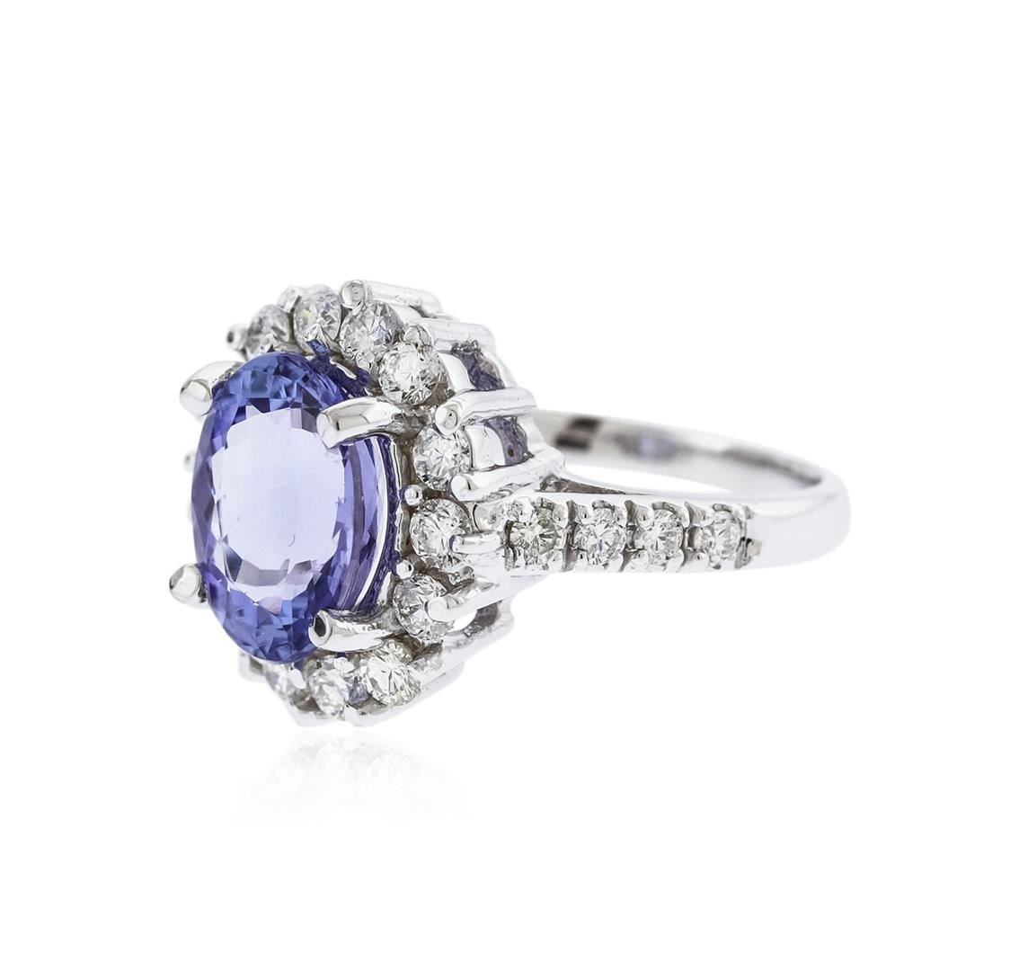 One electronically tested 14KT white gold ladies cast tanzanite and diamond ring with a bright polish finish. Identified with markings of "K14". Condition is new. Containing: One prong set oval modified brilliant cut natural tanzanite, measuring 11.10 x 8.90 x 5.50mm, approximate weight of 3.82ct., clarity is eye clean, type I, medium light, very slightly grayish, violet color, (GIA V 4/3), cut is good. Twenty-Two prong set round brilliant cut diamonds, measuring 2.30 - 2.00 x 1.29mm (depth est.) approximate total weight of 22 Stones = 0.80ct. Clarity: SI-1 to I-1. Color: I - J, Cut is Good. Colored gemstones are presumed to have been subjected to commonly used enhancement processes. All diamonds and colored gemstones are graded in the mounting, unless otherwise stated. Total Weight of Colored Stones 3.82ct. Total Weight of Diamonds 0.80ct. Total Weight of Ring 7.10 grams. GGL Appraised at $5,400.00.