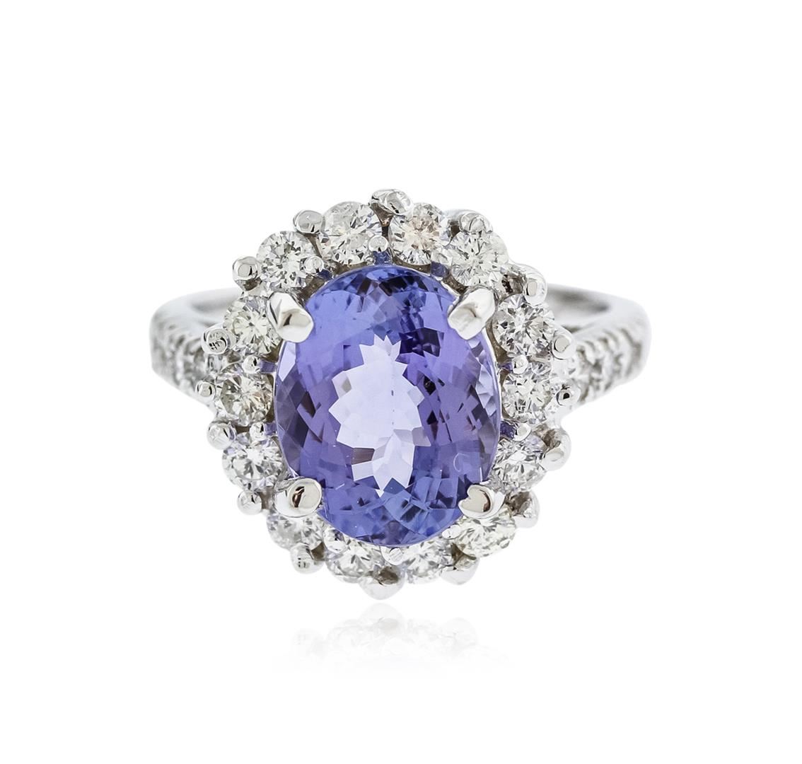One electronically tested 14KT white gold ladies cast tanzanite and diamond ring with a bright polish finish. Identified with markings of "K14". Condition is new. Containing: One prong set oval modified brilliant cut natural tanzanite, measuring 11.10 x 8.90 x 5.50mm, approximate weight of 3.82ct., clarity is eye clean, type I, medium light, very slightly grayish, violet color, (GIA V 4/3), cut is good. Twenty-Two prong set round brilliant cut diamonds, measuring 2.30 - 2.00 x 1.29mm (depth est.) approximate total weight of 22 Stones = 0.80ct. Clarity: SI-1 to I-1. Color: I - J, Cut is Good. Colored gemstones are presumed to have been subjected to commonly used enhancement processes. All diamonds and colored gemstones are graded in the mounting, unless otherwise stated. Total Weight of Colored Stones 3.82ct. Total Weight of Diamonds 0.80ct. Total Weight of Ring 7.10 grams. GGL Appraised at $5,400.00.