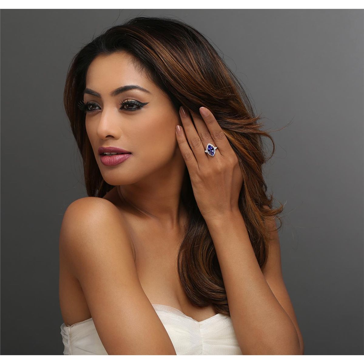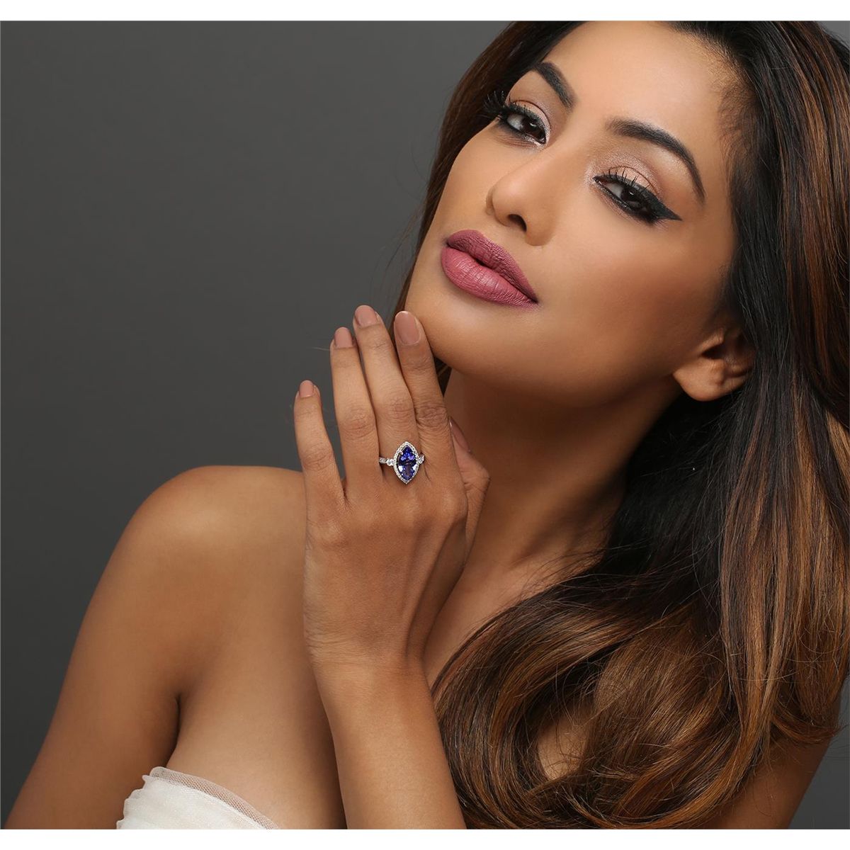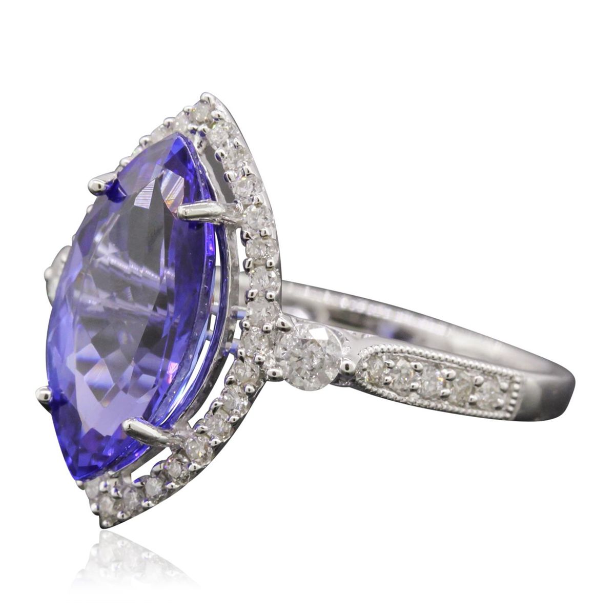 One electronically tested 14KT white gold Ladies cast ring with a bright polish finish. Condition is new. Identified with markings of "14K". Containing: One prong set marquise modified brilliant cut natural tanzanite, measuring 14.70 x 7.70 x 5.30mm, approximate weight of 3.82ct., clarity is eye clean, type I, medium light, very slightly grayish, bluish violet color, (GIA bV 4/3), cut is very good. Colored gemstones are presumed to have been subjected to commonly used color/clarity enhancement processes. Two prong set round brilliant cut diamonds, measuring 2.80 - 2.80 x 1.68mm (depth est.) approximate. Total Weight of 2 Stones = 0.16ct. Clarity: I-2 to I-3. Color: H - I, Cut is Good. All grading of diamonds and colored gemstones in this piece of jewelry are graded in the mounting, unless otherwise stated. Total Weight of Colored Stones 3.82ct. Total Weight of Diamonds 0.16ct. Total Weight of Ring 3.30 grams. GGL Appraised at $6,390.00.