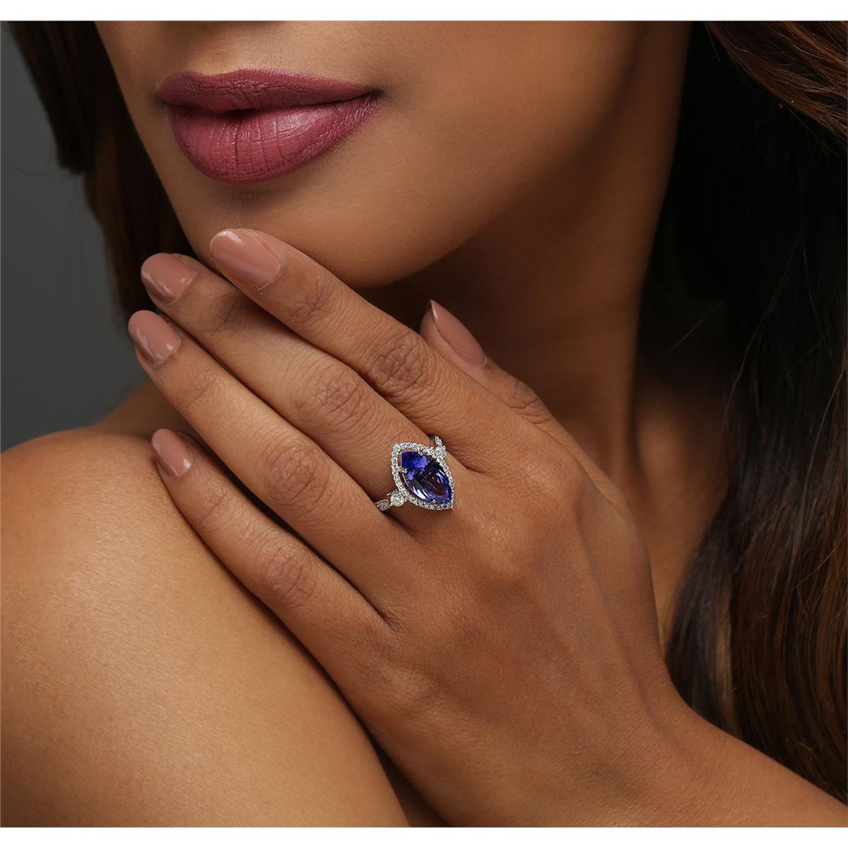 One electronically tested 14KT white gold Ladies cast ring with a bright polish finish. Condition is new. Identified with markings of "14K". Containing: One prong set marquise modified brilliant cut natural tanzanite, measuring 14.70 x 7.70 x 5.30mm, approximate weight of 3.82ct., clarity is eye clean, type I, medium light, very slightly grayish, bluish violet color, (GIA bV 4/3), cut is very good. Colored gemstones are presumed to have been subjected to commonly used color/clarity enhancement processes. Two prong set round brilliant cut diamonds, measuring 2.80 - 2.80 x 1.68mm (depth est.) approximate. Total Weight of 2 Stones = 0.16ct. Clarity: I-2 to I-3. Color: H - I, Cut is Good. All grading of diamonds and colored gemstones in this piece of jewelry are graded in the mounting, unless otherwise stated. Total Weight of Colored Stones 3.82ct. Total Weight of Diamonds 0.16ct. Total Weight of Ring 3.30 grams. GGL Appraised at $6,390.00.