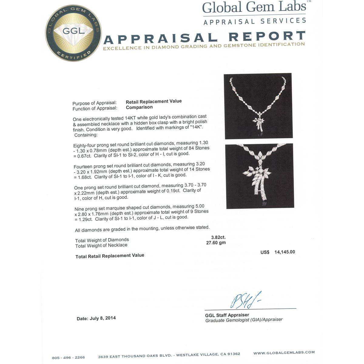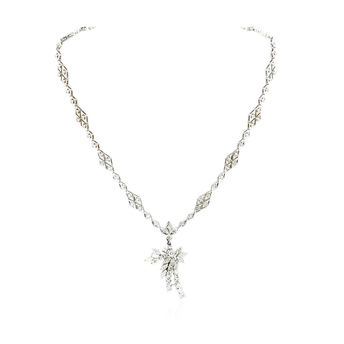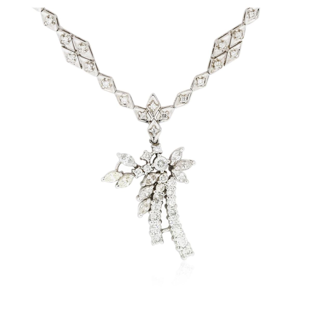One electronically tested 14KT white gold Ladies combination cast & assembled necklace with a hidden box clasp with a bright polish finish. Condition is very good. Identified with markings of "14K". Containing: Eighty-Four prong set round brilliant cut diamonds, measuring 1.30 - 1.30 x 0.78mm (depth est.) approximate. Total Weight of 84 Stones = 0.67ct. Clarity: SI-1 to SI-2. Color: H - I, Cut is Good. Fourteen prong set round brilliant cut diamonds, measuring 3.20 - 3.20 x 1.92mm (depth est.) approximate. Total Weight of 14 Stones = 1.68ct. Clarity: SI-1 to I-1. Color: I - K, Cut is Good. One prong set round brilliant cut diamond, measuring 3.70 - 3.70 x 2.22mm (depth est.) approximate weight of 0.19ct. Clarity: I-1. Color: H, Cut is Good. Nine prong set marquise shaped cut diamonds, measuring 5.00 x 2.80 x 1.76mm (depth est.) approximate. Total Weight of 9 Stones = 1.29ct. Clarity: SI-1 to I-1. Color: J - L, Cut is Good. All diamonds are graded in the mounting, unless otherwise stated. Total Weight of Diamonds 3.82ct. Total Weight of Necklace 27.60 grams. GGL Appraised at $14,145.00.