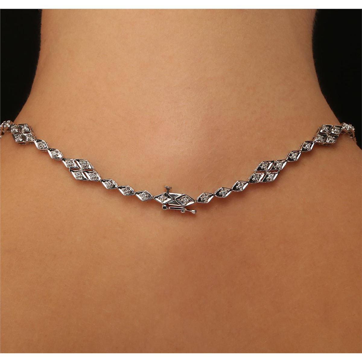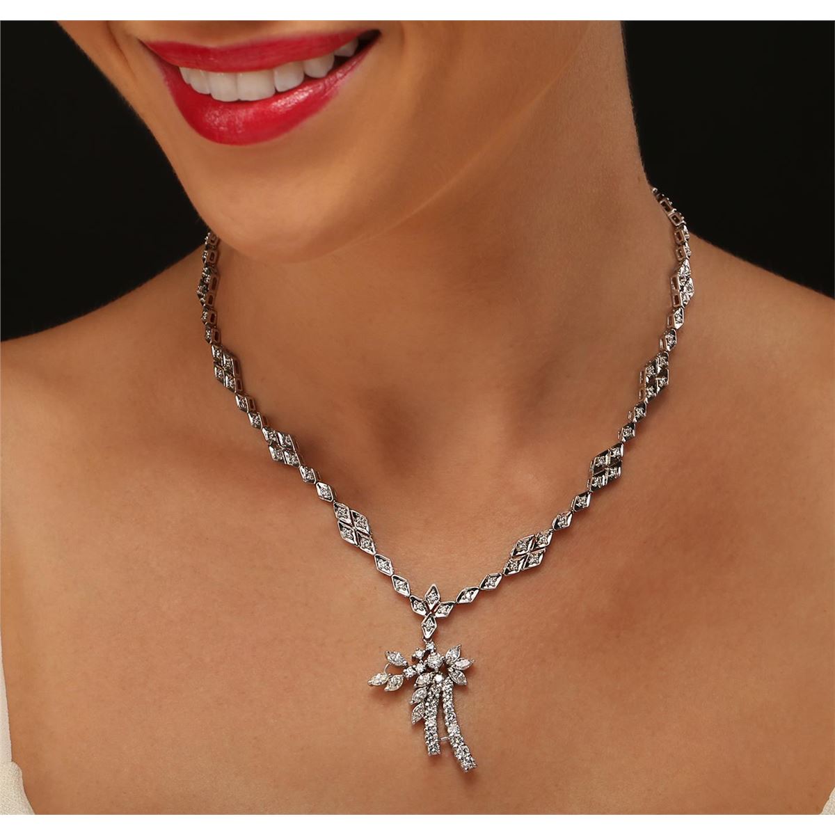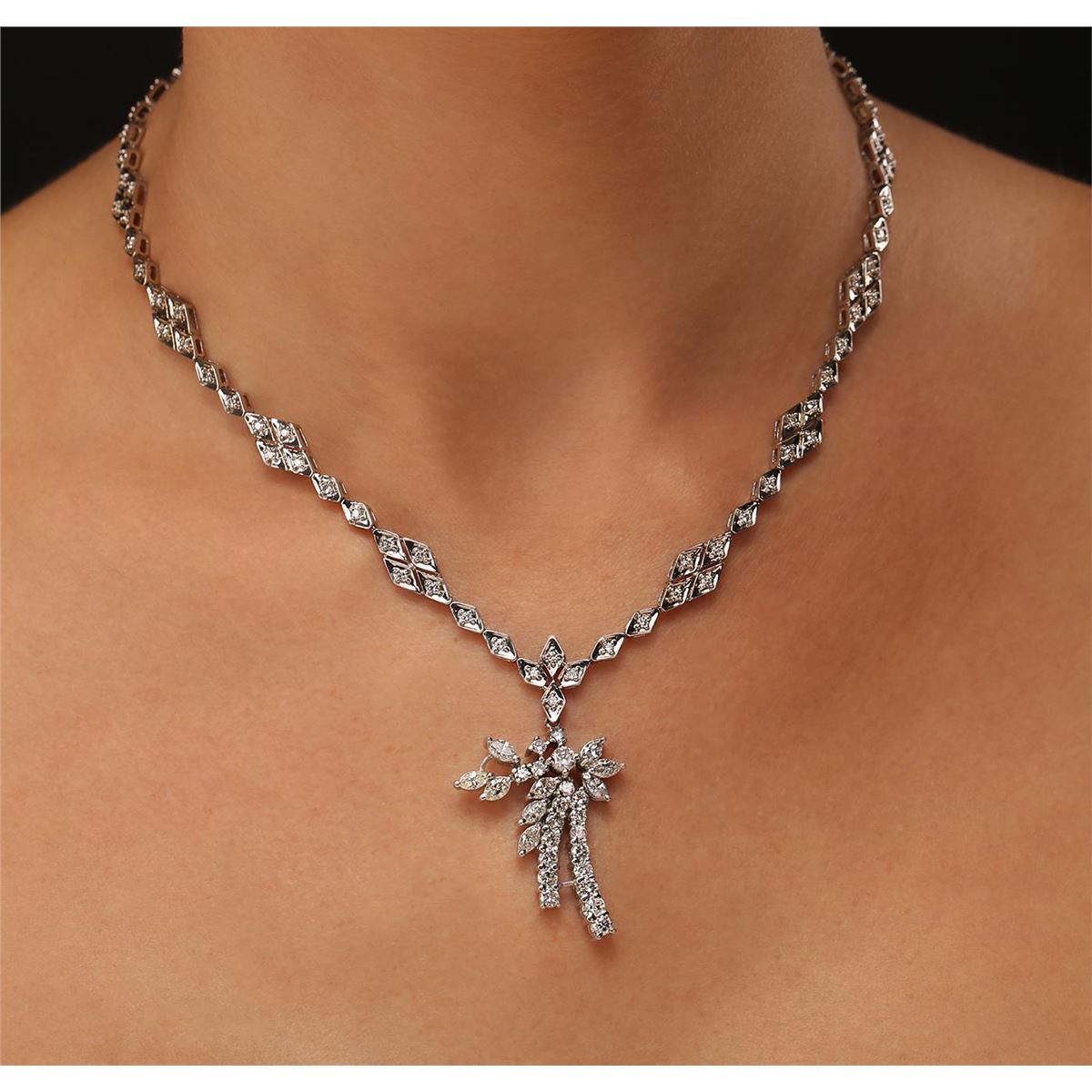 One electronically tested 14KT white gold Ladies combination cast & assembled necklace with a hidden box clasp with a bright polish finish. Condition is very good. Identified with markings of "14K". Containing: Eighty-Four prong set round brilliant cut diamonds, measuring 1.30 - 1.30 x 0.78mm (depth est.) approximate. Total Weight of 84 Stones = 0.67ct. Clarity: SI-1 to SI-2. Color: H - I, Cut is Good. Fourteen prong set round brilliant cut diamonds, measuring 3.20 - 3.20 x 1.92mm (depth est.) approximate. Total Weight of 14 Stones = 1.68ct. Clarity: SI-1 to I-1. Color: I - K, Cut is Good. One prong set round brilliant cut diamond, measuring 3.70 - 3.70 x 2.22mm (depth est.) approximate weight of 0.19ct. Clarity: I-1. Color: H, Cut is Good. Nine prong set marquise shaped cut diamonds, measuring 5.00 x 2.80 x 1.76mm (depth est.) approximate. Total Weight of 9 Stones = 1.29ct. Clarity: SI-1 to I-1. Color: J - L, Cut is Good. All diamonds are graded in the mounting, unless otherwise stated. Total Weight of Diamonds 3.82ct. Total Weight of Necklace 27.60 grams. GGL Appraised at $14,145.00.