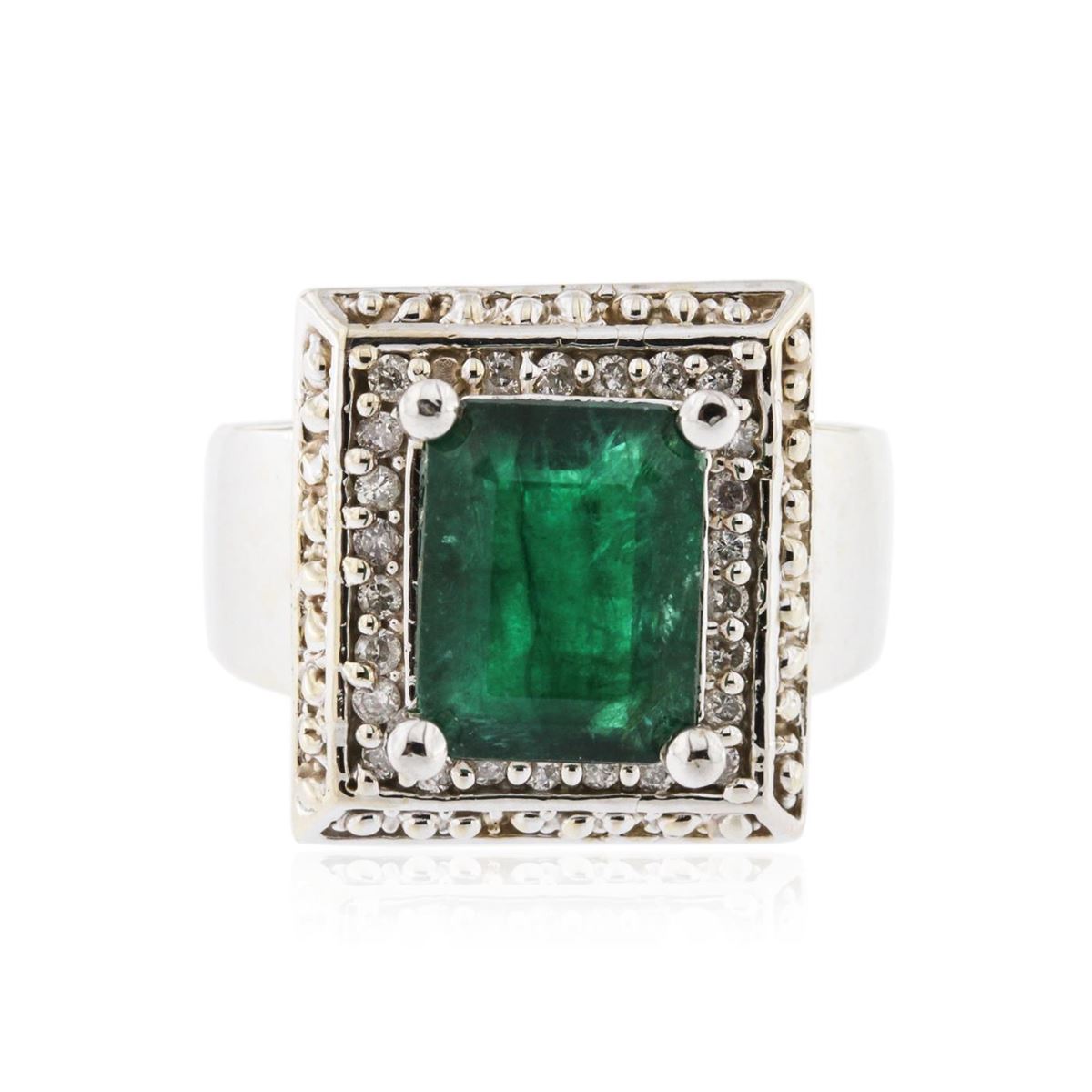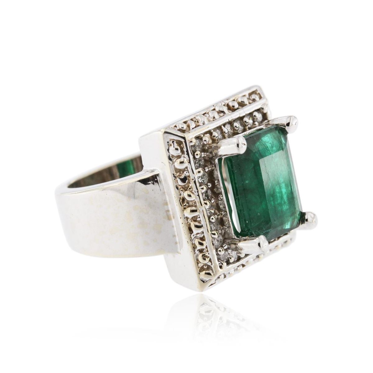 One polished, stamped, and electronically tested solid 14KT White Gold ring mounted with: 1 genuine emerald center stone weighing 3.83 carats and 25 genuine round full cut diamonds weighing 0.29 carats. This item weighs 11.6 grams, condition is new, good workmanship. AIGL Appraised at $4,900.00.