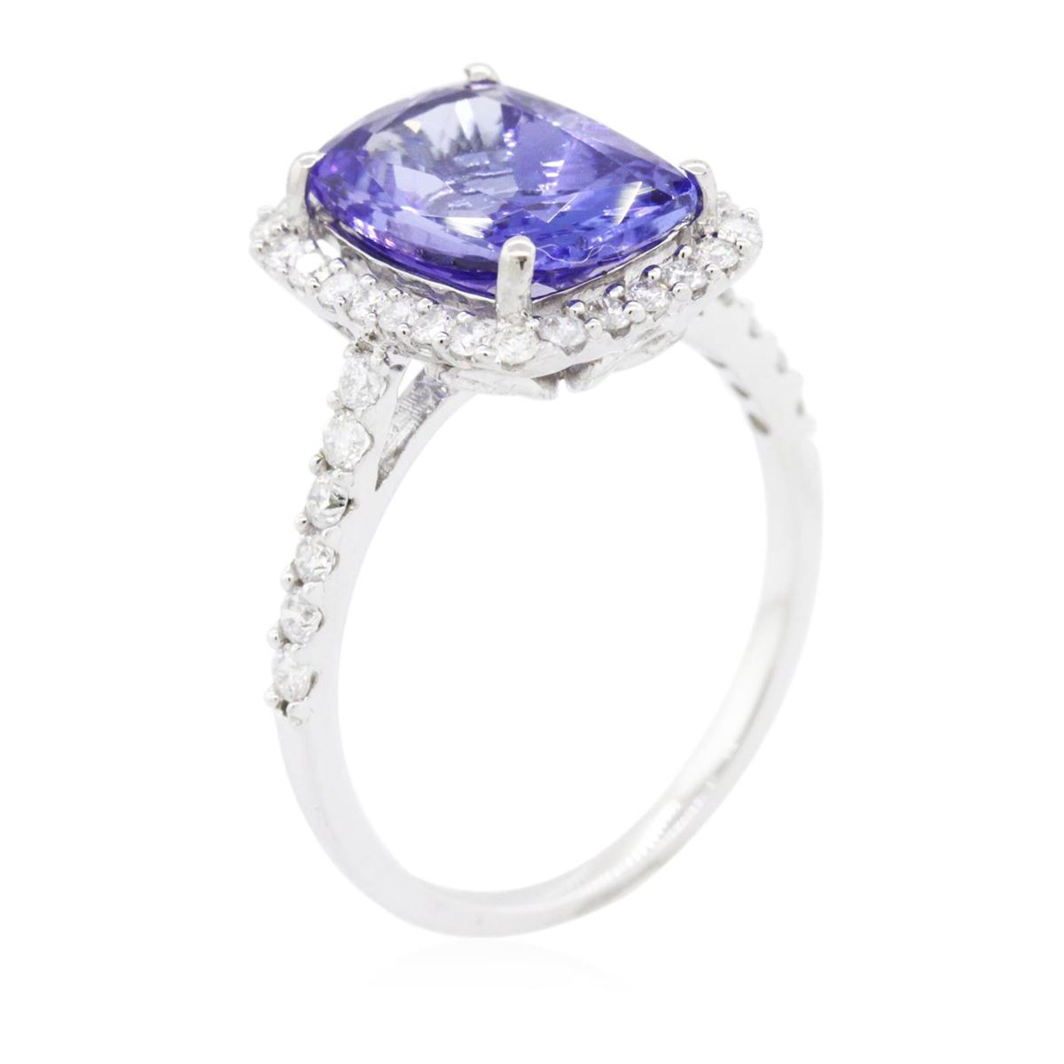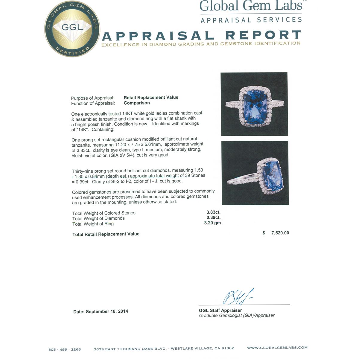 One electronically tested 14KT white gold ladies combination cast & assembled tanzanite and diamond ring with a flat shank with a bright polish finish. Identified with markings of "14K". Condition is new. Containing: One prong set rectangular cushion modified brilliant cut natural tanzanite, measuring 11.20 x 7.75 x 5.61mm, approximate weight of 3.83ct., clarity is eye clean, type I, medium, moderately strong, bluish violet color, (GIA bV 5/4), cut is very good. Thirty-Nine prong set round brilliant cut diamonds, measuring 1.50 - 1.30 x 0.84mm (depth est.) approximate total weight of 39 Stones = 0.39ct. Clarity: SI-2 to I-2. Color: I - J, Cut is Good. Colored gemstones are presumed to have been subjected to commonly used enhancement processes. All diamonds and colored gemstones are graded in the mounting, unless otherwise stated. Total Weight of Colored Stones 3.83ct. Total Weight of Diamonds 0.39ct. Total Weight of Ring 3.20 grams. GGL Appraised at $7,520.00.