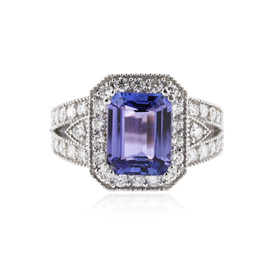 One electronically tested 14KT white gold ladies cast tanzanite and diamond ring with a bright polish finish. Identified with markings of "K14". Condition is new. Containing: One prong set emerald standard step cut natural tanzanite, measuring 10.00. x 7.70 x 5.50mm, approximate weight of 3.83ct., clarity is eye clean, type I, light, very slightly grayish, violet color, (GIA V 3/3), cut is good. Forty-Four prong set round brilliant cut diamonds, measuring 1.80 - 1.80 x 1.08mm (depth est.) approximate total weight of 44 Stones = 0.94ct. Clarity: SI-1 to SI-2. Color: H - I, Cut is Good. Colored gemstones are presumed to have been subjected to commonly used enhancement processes. All diamonds and colored gemstones are graded in the mounting, unless otherwise stated. Total Weight of Colored Stones 3.83ct. Total Weight of Diamonds 0.94ct. Total Weight of Ring 7.30 grams. GGL Appraised at $6,305.00.
