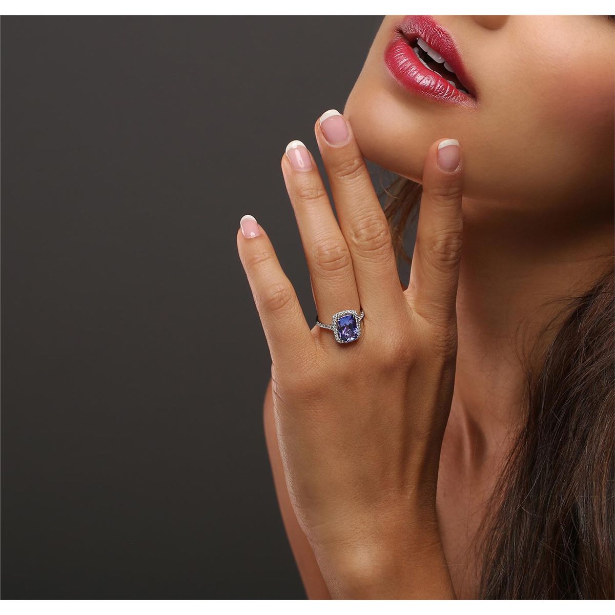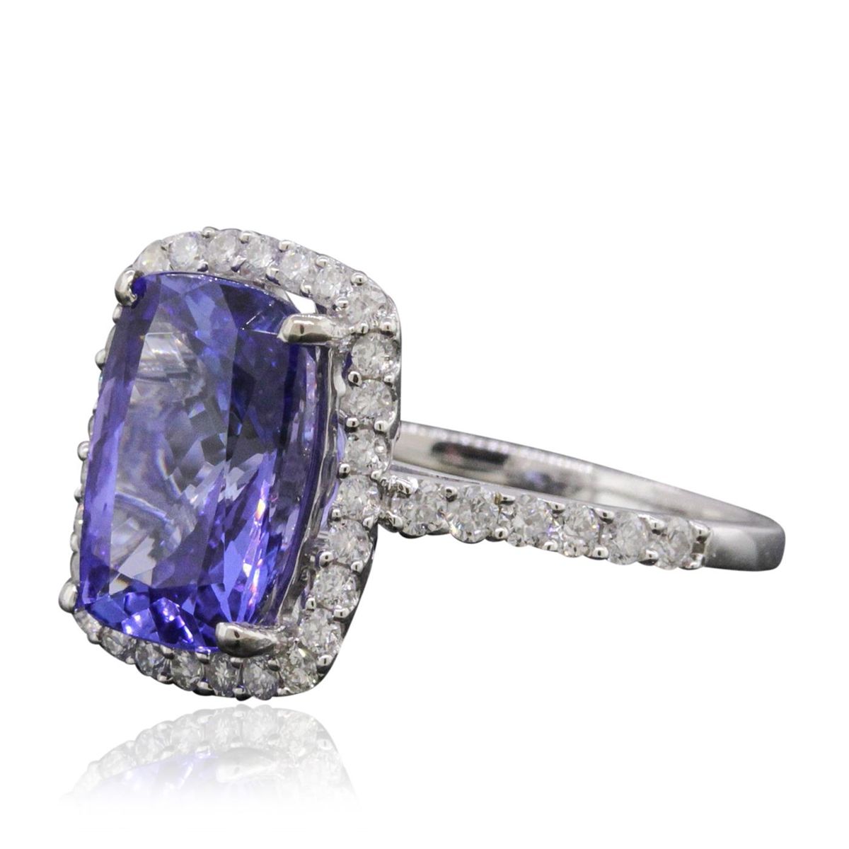 One electronically tested 14KT white gold ladies combination cast & assembled tanzanite and diamond ring with a flat shank with a bright polish finish. Identified with markings of "14K". Condition is new. Containing: One prong set rectangular cushion modified brilliant cut natural tanzanite, measuring 11.20 x 7.75 x 5.61mm, approximate weight of 3.83ct., clarity is eye clean, type I, medium, moderately strong, bluish violet color, (GIA bV 5/4), cut is very good. Thirty-Nine prong set round brilliant cut diamonds, measuring 1.50 - 1.30 x 0.84mm (depth est.) approximate total weight of 39 Stones = 0.39ct. Clarity: SI-2 to I-2. Color: I - J, Cut is Good. Colored gemstones are presumed to have been subjected to commonly used enhancement processes. All diamonds and colored gemstones are graded in the mounting, unless otherwise stated. Total Weight of Colored Stones 3.83ct. Total Weight of Diamonds 0.39ct. Total Weight of Ring 3.20 grams. GGL Appraised at $7,520.00.