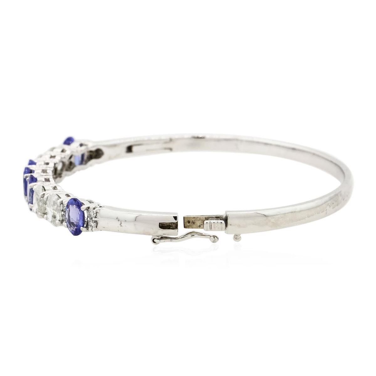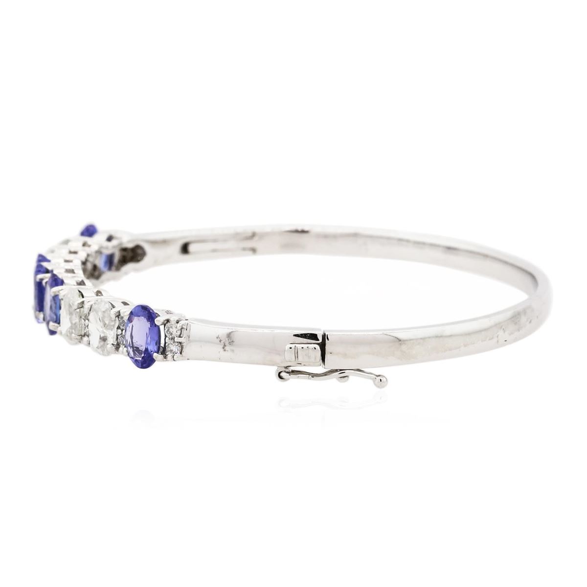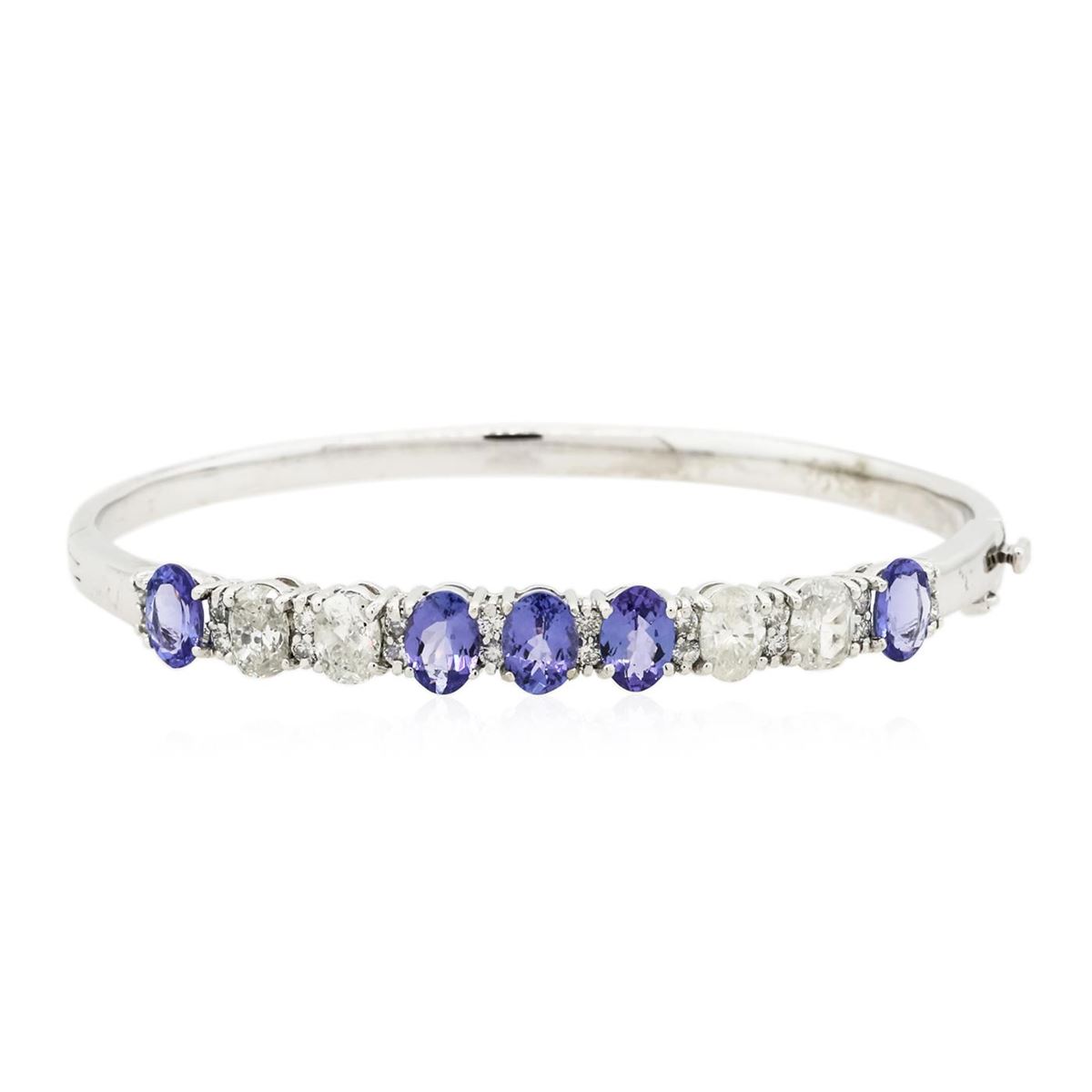 One electronically tested 14KT white gold ladies cast & assembled tanzanite and diamond bangle bracelet with a bright polish finish. Condition is new, good workmanship. Seven inch length bangle bracelet features a tanzanite and diamond ribbon supported by a hinged shoulder, terminating in a concealed clasp with safety. Identified with markings of "K14". Containing: Five prong set oval mixed cut natural tanzanites, measuring 6.90 x 4.90 x 3.10mm, 6%. bulge factor, approximate. Total Weight of 3.85ct., clarity is eye clean, type I, medium dark, very slightly grayish, bluish violet color, (GIA bV 6/3), cut is good. Transmitting light with no distortion, transparent. Measurements & the color grade are an average for the group. Graded in the setting. Tanzanite is a very rare gemstone that is only found in the country of Tanzania. Originally discovered in 1967. Tiffany & Company, named the stone Tanzanite. It is found in the Usumburu Mountains that border the Umba Valley of northern Tanzania. Tanzanite occurs in gray, brown, violet, blue, reddish-purple, & green. The gem is interesting because of its exceptional pleochroism. Rotated in different directions a tanzanite will exhibit multiple changes of color. Tanzanite has a low tolerance to ultrasonic cleaning, and should not be cleaned using this method. Four prong set oval shaped cut diamonds, measuring 6.20 x 4.50 x 3.10mm (depth est.) approximate. Total Weight of 4 Stones = 2.30ct. Graded in the setting. Clarity: I-1 to I-2 . Color: H - J Twenty prong set round brilliant cut diamonds, measuring 2.10 - 2.00. x 1.23mm (depth est.) approximate. Total Weight of 20 Stones = 0.73ct. Graded in the setting. Clarity: SI-1 to I-1 . Color: G - I. Total Weight of Colored Stones 3.85ct.. Total Weight of Diamonds 3.03ct.. Total Weight of Bangle Bracelet 17.37gm. AIG Appraised at $17,265.00.