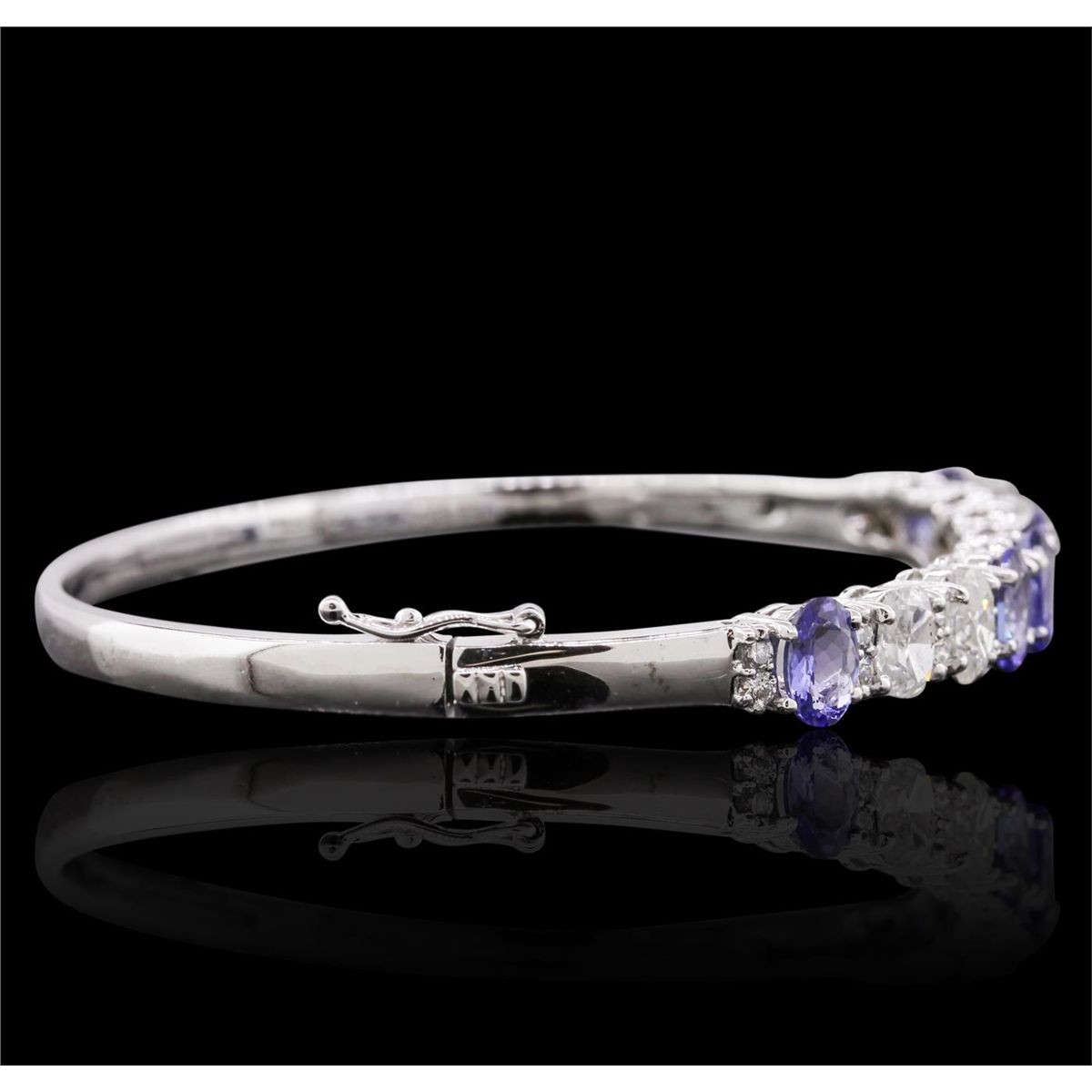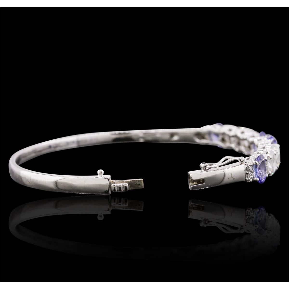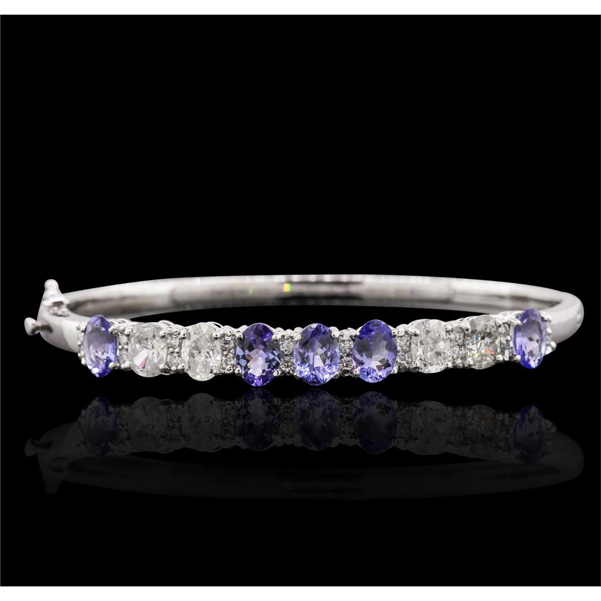One electronically tested 14KT white gold ladies cast & assembled tanzanite and diamond bangle bracelet with a bright polish finish. Condition is new, good workmanship. Seven inch length bangle bracelet features a tanzanite and diamond ribbon supported by a hinged shoulder, terminating in a concealed clasp with safety. Identified with markings of "K14". Containing: Five prong set oval mixed cut natural tanzanites, measuring 6.90 x 4.90 x 3.10mm, 6%. bulge factor, approximate. Total Weight of 3.85ct., clarity is eye clean, type I, medium dark, very slightly grayish, bluish violet color, (GIA bV 6/3), cut is good. Transmitting light with no distortion, transparent. Measurements & the color grade are an average for the group. Graded in the setting. Tanzanite is a very rare gemstone that is only found in the country of Tanzania. Originally discovered in 1967. Tiffany & Company, named the stone Tanzanite. It is found in the Usumburu Mountains that border the Umba Valley of northern Tanzania. Tanzanite occurs in gray, brown, violet, blue, reddish-purple, & green. The gem is interesting because of its exceptional pleochroism. Rotated in different directions a tanzanite will exhibit multiple changes of color. Tanzanite has a low tolerance to ultrasonic cleaning, and should not be cleaned using this method. Four prong set oval shaped cut diamonds, measuring 6.20 x 4.50 x 3.10mm (depth est.) approximate. Total Weight of 4 Stones = 2.30ct. Graded in the setting. Clarity: I-1 to I-2 . Color: H - J Twenty prong set round brilliant cut diamonds, measuring 2.10 - 2.00. x 1.23mm (depth est.) approximate. Total Weight of 20 Stones = 0.73ct. Graded in the setting. Clarity: SI-1 to I-1 . Color: G - I. Total Weight of Colored Stones 3.85ct.. Total Weight of Diamonds 3.03ct.. Total Weight of Bangle Bracelet 17.37gm. AIG Appraised at $17,265.00.
