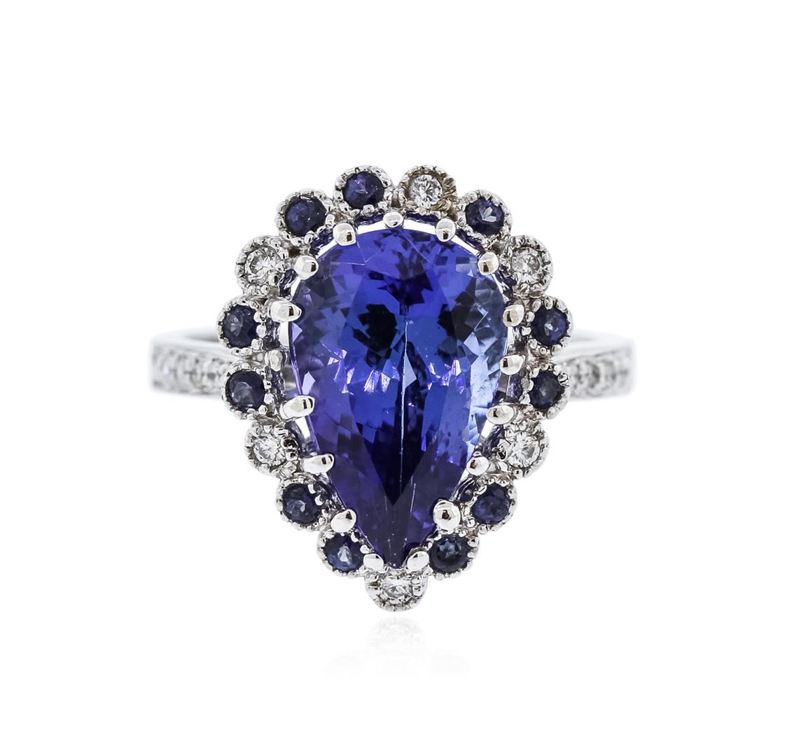 One electronically tested 14KT white gold ladies cast tanzanite, sapphire and diamond ring with a cathedral shank with a bright polish finish. Trademark is Orianne. Identified with markings of "14K". Condition is new. Containing: One prong set pear modified brilliant cut natural tanzanite, measuring 13.11 x 7.51 x 5.85mm, approximate weight of 3.86ct., clarity is eye clean, type I, medium light, very slightly grayish, bluish violet color, (GIA bV 4/3), cut is good. Twelve prong set round modified brilliant cut natural blue sapphires, measuring 2.00 - 2.00 x 1.30 mm, approximate total weight of 0.48ct., clarity is moderately included, type II, medium, moderately strong, blue color, (GIA B 5/4), cut is good. Twenty-Two prong set round brilliant cut diamonds, measuring 1.10 - 1.10 x 0.66mm (depth est.) approximate total weight of 22 Stones = 0.11ct. Clarity: I-1 to I-2. Color: I - J. All diamonds and colored gemstones are graded in the mounting, unless otherwise stated. Colored gemstones are presumed to have been subjected to commonly used enhancement processes. Total Weight of Colored Stones 4.34ct. Total Weight of Diamonds 0.11ct. Total Weight of Ring 5.10 grams. GGL Appraised at $4,260.00.