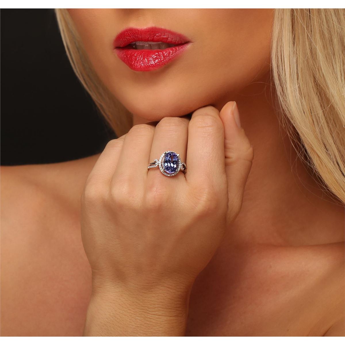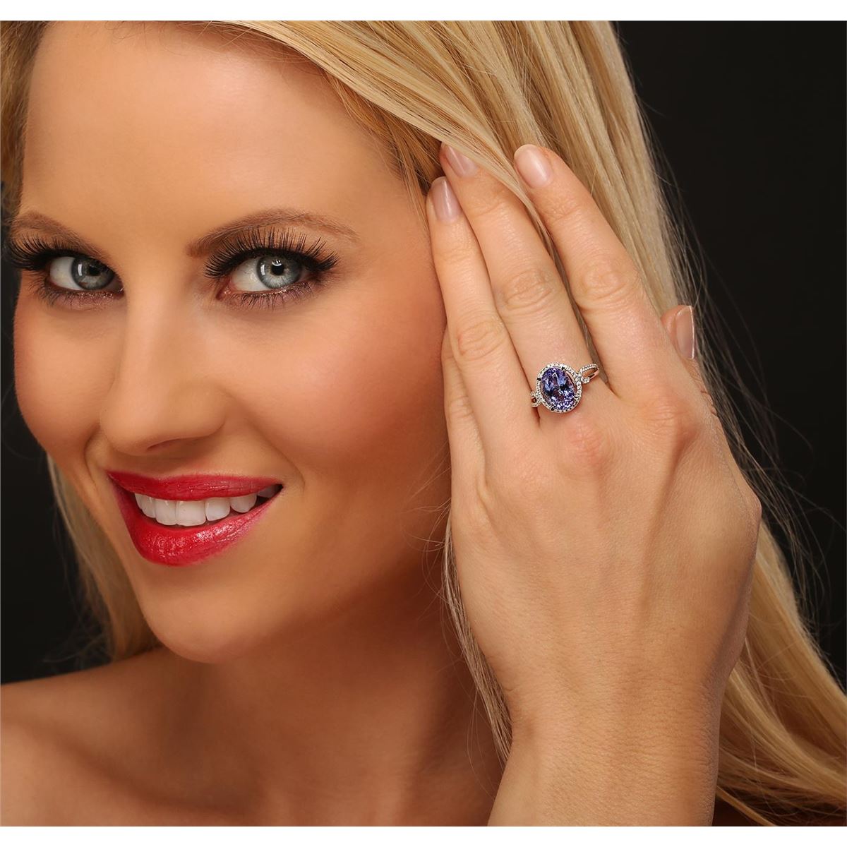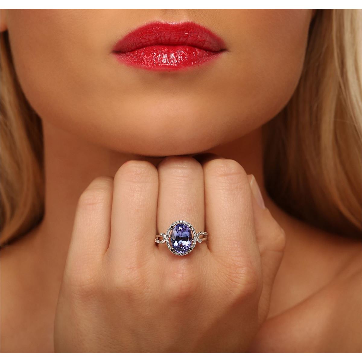 One electronically tested 14KT white gold ladies cast tanzanite and diamond ring with a bright polish finish. Condition is new, good workmanship. The featured tanzanite is set within a diamond bezel supported by diamond set shoulders, completed by a one millimeter wide band. Trademark is PMI. Identified with markings of "14K". Containing: One prong set oval brilliant cut natural tanzanite, measuring 11.25 x 8.10 x 5.70mm, 8%. bulge factor, approximate weight of 3.86ct., clarity is eye clean, type I, medium, very slightly grayish, bluish violet color, (GIA bV 5/3), cut is good. Transmitting light with no distortion, transparent. Graded in the setting. Tanzanite is a very rare gemstone that is only found in the country of Tanzania. Originally discovered in 1967. Tiffany & Company, named the stone Tanzanite. It is found in the Usumburu Mountains that border the Umba Valley of northern Tanzania. Tanzanite occurs in gray, brown, violet, blue, reddish-purple, & green. The gem is interesting because of its exceptional pleochroism. Rotated in different directions a tanzanite will exhibit multiple changes of color. Tanzanite has a low tolerance to ultrasonic cleaning, and should not be cleaned using this method. Fifty-Five prong set round brilliant cut diamonds, measuring 1.10 - 1.00 x 0.63mm (depth est.) approximate. Total Weight of 55 Stones = 0.33ct. Graded in the setting. Clarity: SI-1 to I-1. Color: H - J. Total Weight of Colored Stones 3.86ct. Total Weight of Diamonds 0.33ct. Total Weight of Ring 3.71 grams. AIG Appraised at $10,465.00.