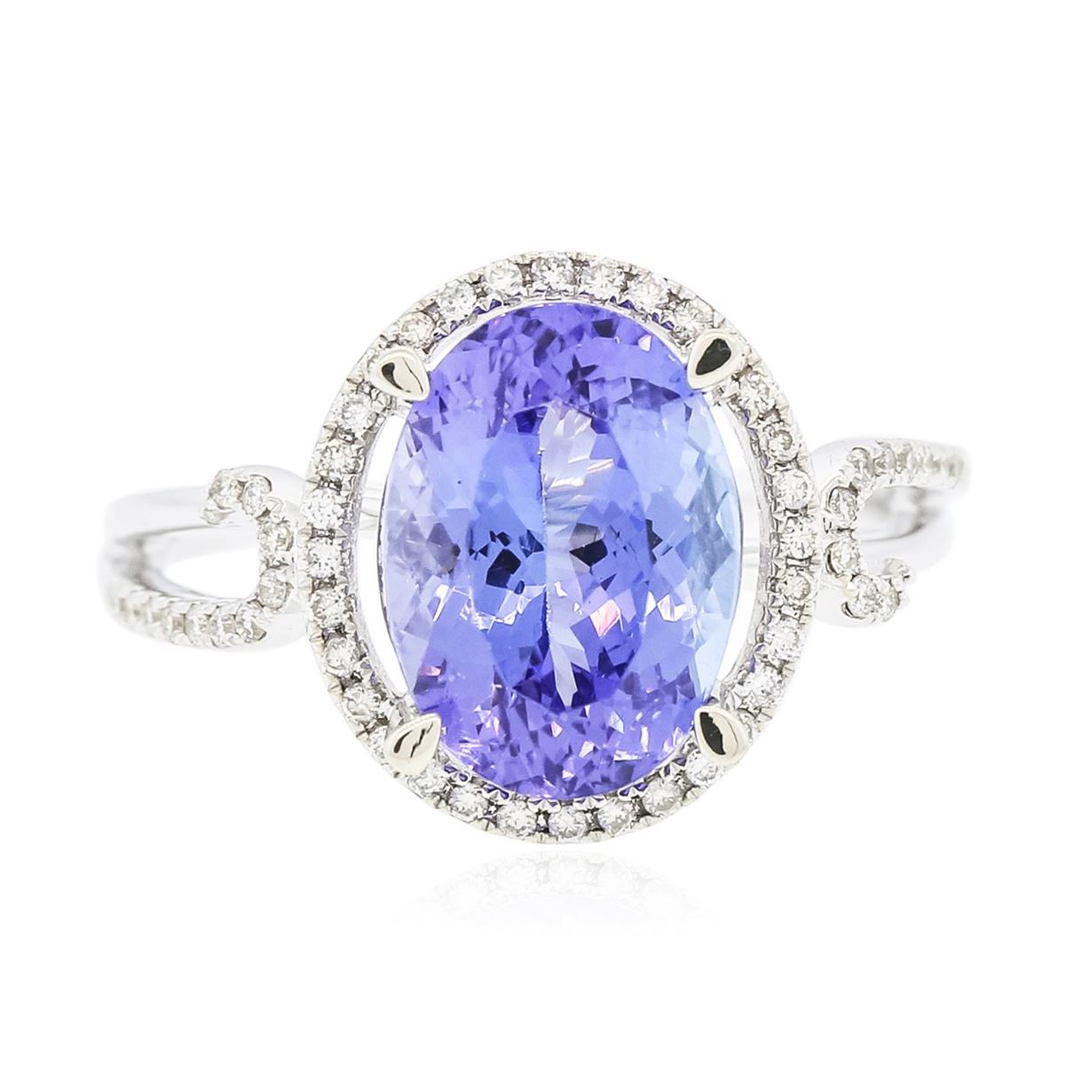 One electronically tested 14KT white gold ladies cast tanzanite and diamond ring with a bright polish finish. Condition is new, good workmanship. The featured tanzanite is set within a diamond bezel supported by diamond set shoulders, completed by a one millimeter wide band. Trademark is PMI. Identified with markings of "14K". Containing: One prong set oval brilliant cut natural tanzanite, measuring 11.25 x 8.10 x 5.70mm, 8%. bulge factor, approximate weight of 3.86ct., clarity is eye clean, type I, medium, very slightly grayish, bluish violet color, (GIA bV 5/3), cut is good. Transmitting light with no distortion, transparent. Graded in the setting. Tanzanite is a very rare gemstone that is only found in the country of Tanzania. Originally discovered in 1967. Tiffany & Company, named the stone Tanzanite. It is found in the Usumburu Mountains that border the Umba Valley of northern Tanzania. Tanzanite occurs in gray, brown, violet, blue, reddish-purple, & green. The gem is interesting because of its exceptional pleochroism. Rotated in different directions a tanzanite will exhibit multiple changes of color. Tanzanite has a low tolerance to ultrasonic cleaning, and should not be cleaned using this method. Fifty-Five prong set round brilliant cut diamonds, measuring 1.10 - 1.00 x 0.63mm (depth est.) approximate. Total Weight of 55 Stones = 0.33ct. Graded in the setting. Clarity: SI-1 to I-1. Color: H - J. Total Weight of Colored Stones 3.86ct. Total Weight of Diamonds 0.33ct. Total Weight of Ring 3.71 grams. AIG Appraised at $10,465.00.