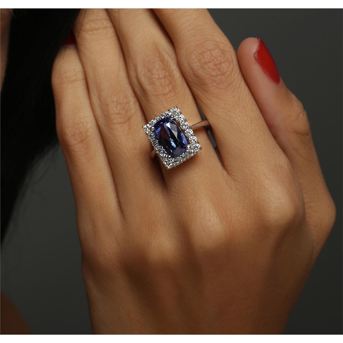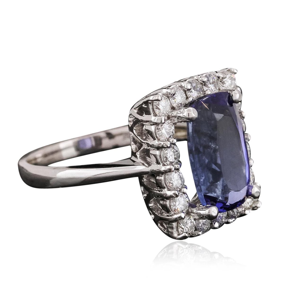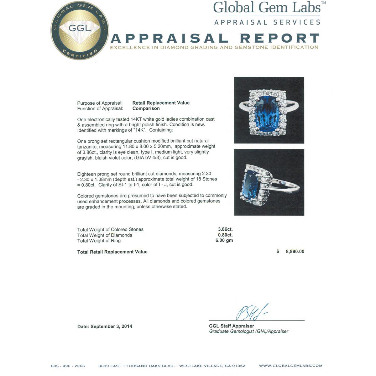 One electronically tested 14KT white gold ladies combination cast & assembled ring with a bright polish finish. Identified with markings of "14K". Condition is new. Containing: One prong set rectangular cushion modified brilliant cut natural tanzanite, measuring 11.80 x 8.00 x 5.20mm, approximate weight of 3.86ct., clarity is eye clean, type I, medium light, very slightly grayish, bluish violet color, (GIA bV 4/3), cut is good. Eighteen prong set round brilliant cut diamonds, measuring 2.30 - 2.30 x 1.38mm (depth est.) approximate total weight of 18 Stones = 0.80ct. Clarity: SI-1 to I-1. Color: I - J, Cut is Good. Colored gemstones are presumed to have been subjected to commonly used enhancement processes. All diamonds and colored gemstones are graded in the mounting, unless otherwise stated. Total Weight of Colored Stones 3.86ct. Total Weight of Diamonds 0.80ct. Total Weight of Ring 6.00 grams. GGL Appraised at $8,890.00.
