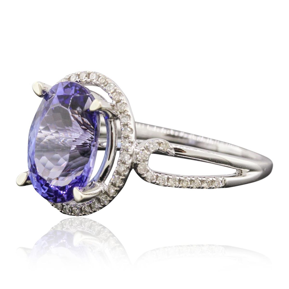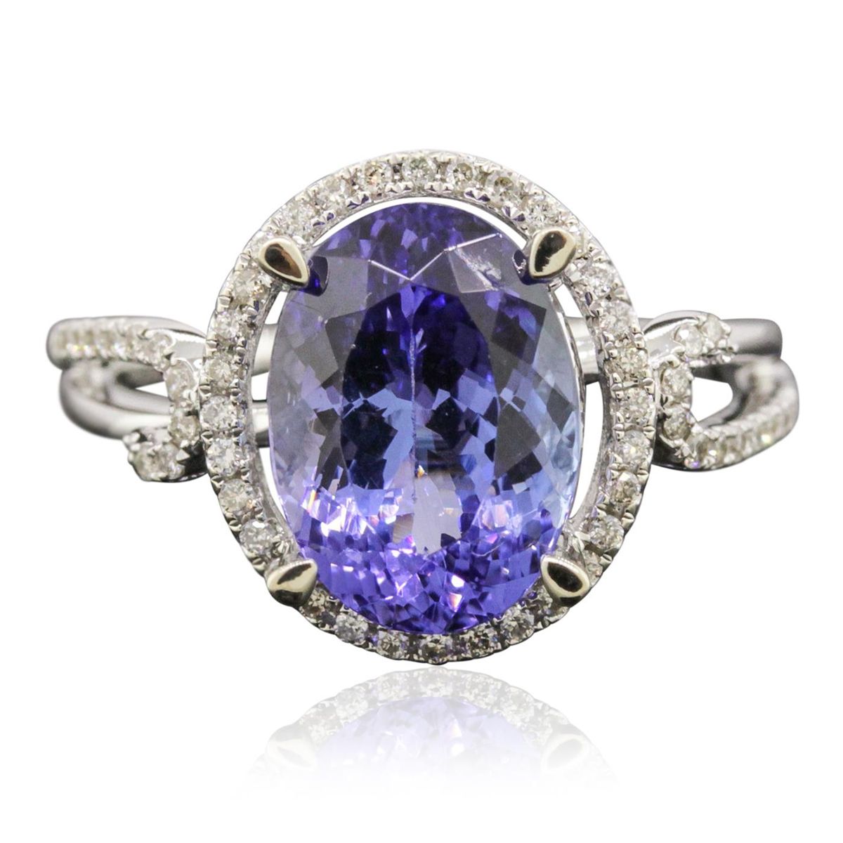 One electronically tested 14KT white gold ladies cast tanzanite and diamond ring with a bright polish finish. Condition is new, good workmanship. The featured tanzanite is set within a diamond bezel supported by diamond set shoulders, completed by a one millimeter wide band. Trademark is PMI. Identified with markings of "14K". Containing: One prong set oval brilliant cut natural tanzanite, measuring 11.25 x 8.10 x 5.70mm, 8%. bulge factor, approximate weight of 3.86ct., clarity is eye clean, type I, medium, very slightly grayish, bluish violet color, (GIA bV 5/3), cut is good. Transmitting light with no distortion, transparent. Graded in the setting. Tanzanite is a very rare gemstone that is only found in the country of Tanzania. Originally discovered in 1967. Tiffany & Company, named the stone Tanzanite. It is found in the Usumburu Mountains that border the Umba Valley of northern Tanzania. Tanzanite occurs in gray, brown, violet, blue, reddish-purple, & green. The gem is interesting because of its exceptional pleochroism. Rotated in different directions a tanzanite will exhibit multiple changes of color. Tanzanite has a low tolerance to ultrasonic cleaning, and should not be cleaned using this method. Fifty-Five prong set round brilliant cut diamonds, measuring 1.10 - 1.00 x 0.63mm (depth est.) approximate. Total Weight of 55 Stones = 0.33ct. Graded in the setting. Clarity: SI-1 to I-1. Color: H - J. Total Weight of Colored Stones 3.86ct. Total Weight of Diamonds 0.33ct. Total Weight of Ring 3.71 grams. AIG Appraised at $10,465.00.