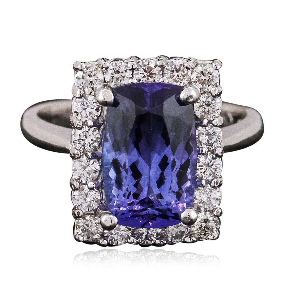 One electronically tested 14KT white gold ladies combination cast & assembled ring with a bright polish finish. Identified with markings of "14K". Condition is new. Containing: One prong set rectangular cushion modified brilliant cut natural tanzanite, measuring 11.80 x 8.00 x 5.20mm, approximate weight of 3.86ct., clarity is eye clean, type I, medium light, very slightly grayish, bluish violet color, (GIA bV 4/3), cut is good. Eighteen prong set round brilliant cut diamonds, measuring 2.30 - 2.30 x 1.38mm (depth est.) approximate total weight of 18 Stones = 0.80ct. Clarity: SI-1 to I-1. Color: I - J, Cut is Good. Colored gemstones are presumed to have been subjected to commonly used enhancement processes. All diamonds and colored gemstones are graded in the mounting, unless otherwise stated. Total Weight of Colored Stones 3.86ct. Total Weight of Diamonds 0.80ct. Total Weight of Ring 6.00 grams. GGL Appraised at $8,890.00.