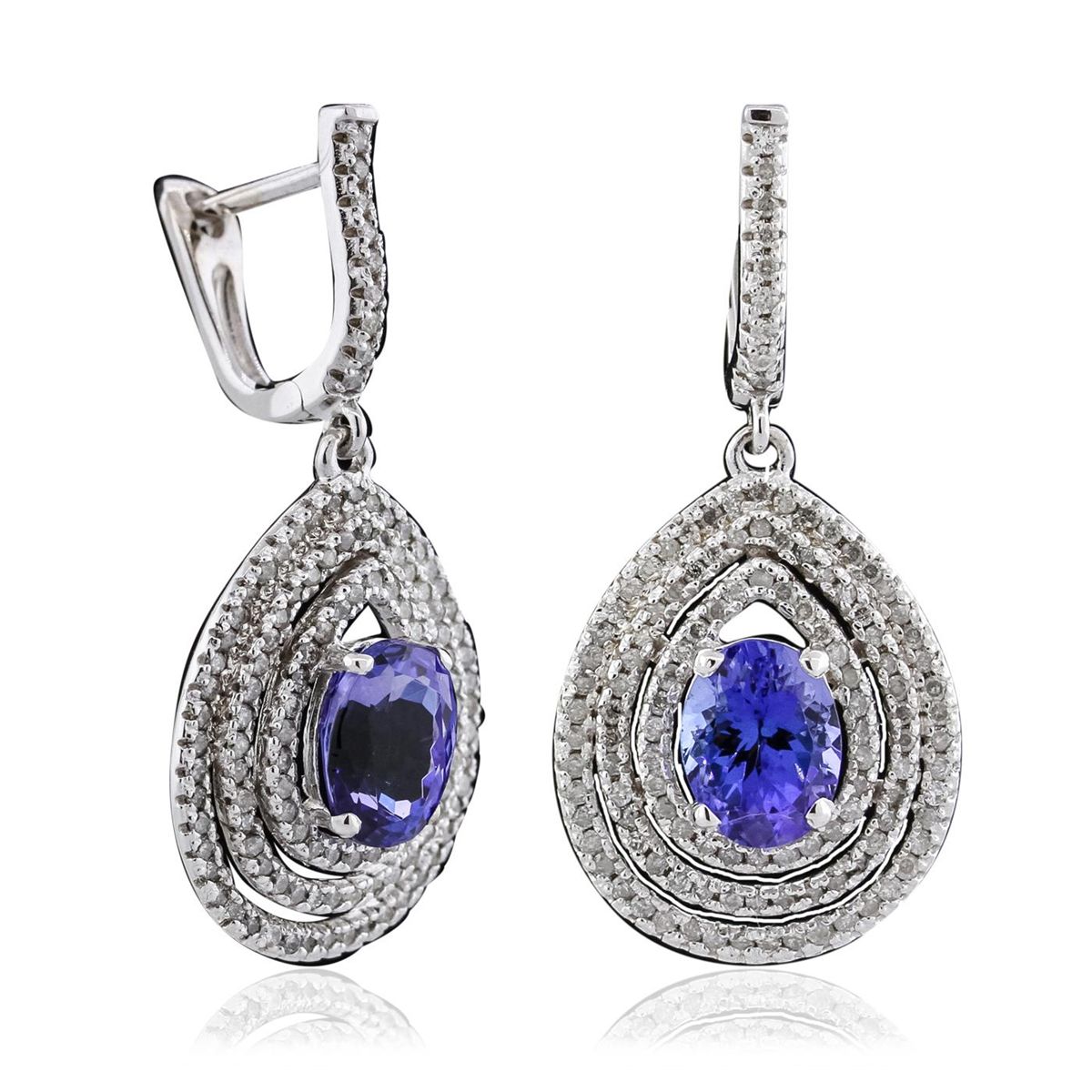 One pair electronically tested 14KT white gold ladies combination cast & assembled dangle earrings with hinged clip backs with a bright polish finish. Identified with markings of "585". Condition is new. Containing: Two prong set pear modified brilliant cut natural tanzanites, measuring 8.45 x 6.65 x 5.12mm, approximate total weight of 3.86ct., clarity is eye clean, type I, medium light, moderately strong, bluish violet color, (GIA bV 4/4), cut is good. Two Hundred Twenty-Six prong set round brilliant cut diamonds, measuring 1.20 - 1.20 x 0.72mm (depth est.) approximate total weight of 226 Stones = 1.42ct. Clarity: I-2 to I-3. Color: H - I, Cut is Good. Colored gemstones are presumed to have been subjected to commonly used enhancement processes. All diamonds and colored gemstones are graded in the mounting, unless otherwise stated. Total Weight of Colored Stones 3.86ct. Total Weight of Diamonds 1.42ct. Total Weight of Earrings 7.90 grams. GGL Appraised at $10,145.00.
