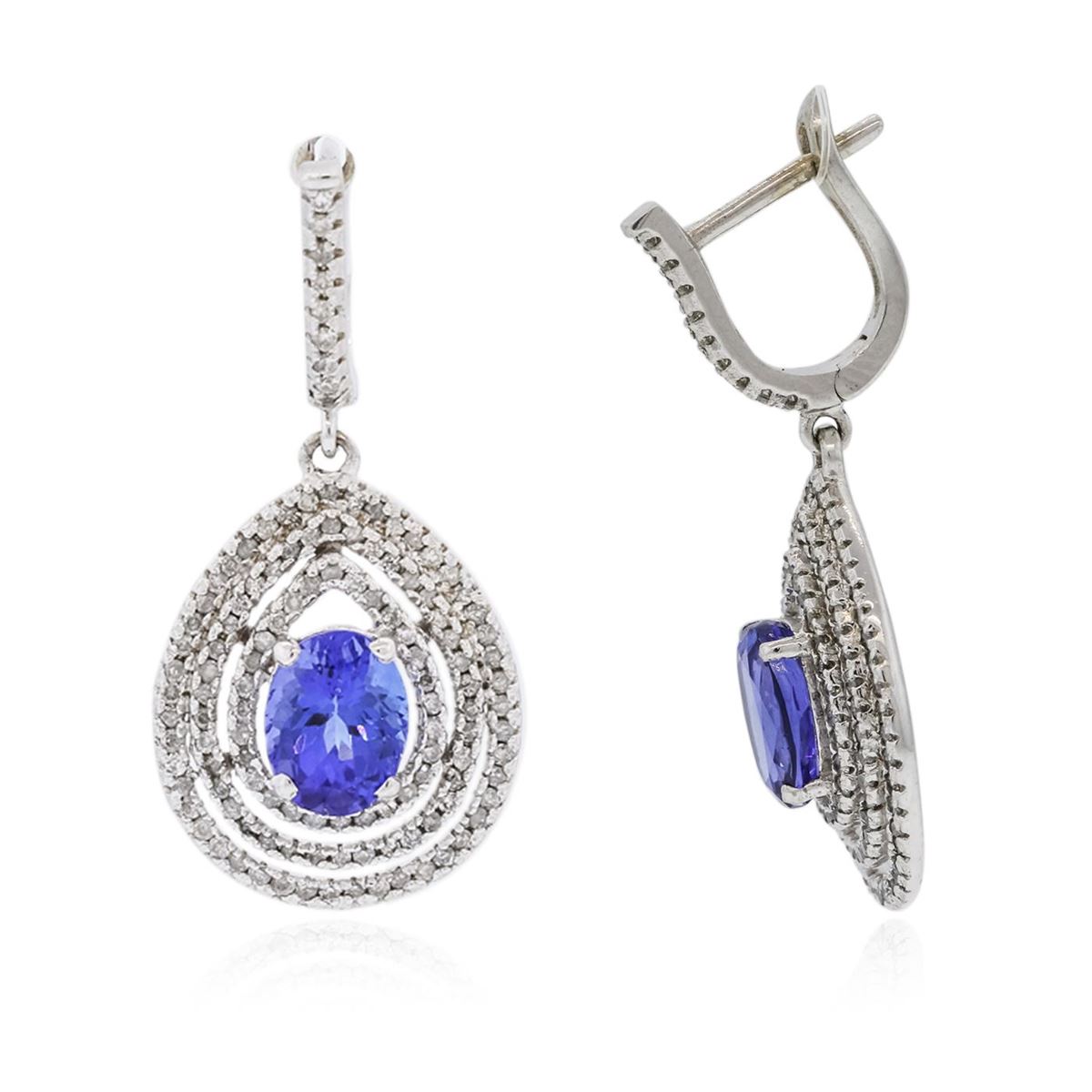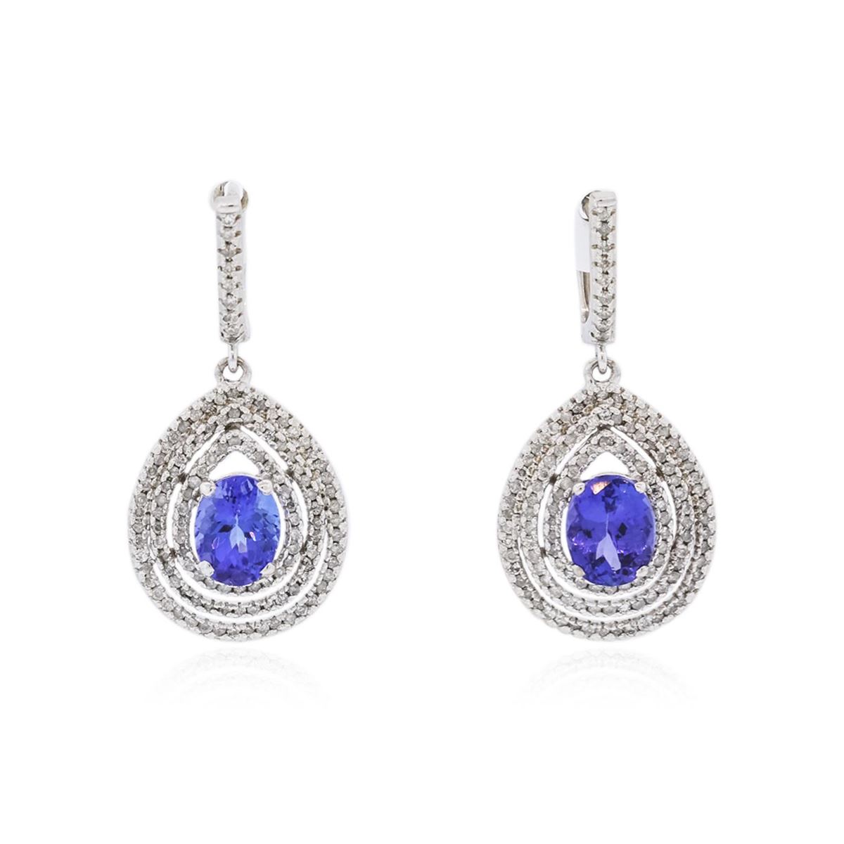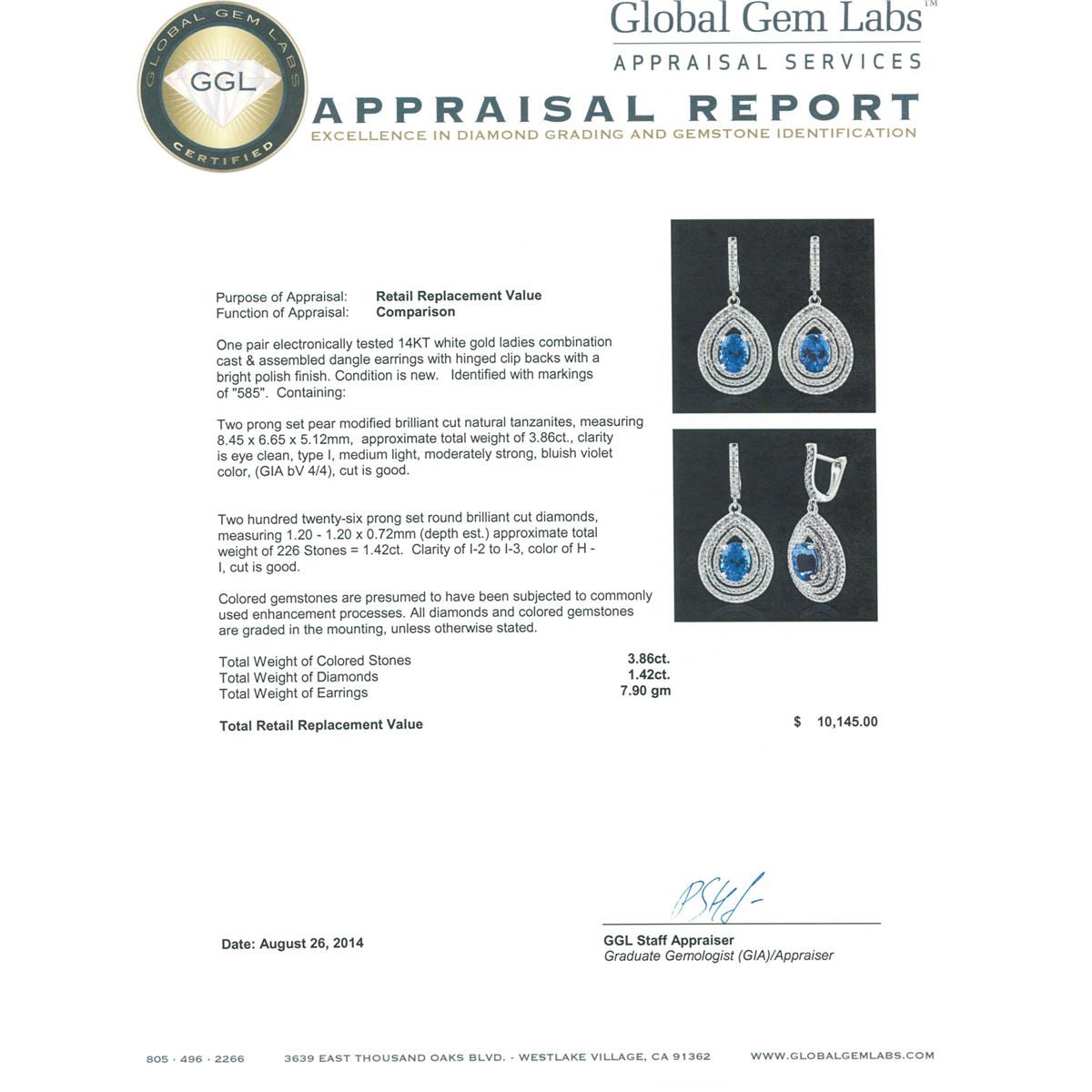 One pair electronically tested 14KT white gold ladies combination cast & assembled dangle earrings with hinged clip backs with a bright polish finish. Identified with markings of "585". Condition is new. Containing: Two prong set pear modified brilliant cut natural tanzanites, measuring 8.45 x 6.65 x 5.12mm, approximate total weight of 3.86ct., clarity is eye clean, type I, medium light, moderately strong, bluish violet color, (GIA bV 4/4), cut is good. Two Hundred Twenty-Six prong set round brilliant cut diamonds, measuring 1.20 - 1.20 x 0.72mm (depth est.) approximate total weight of 226 Stones = 1.42ct. Clarity: I-2 to I-3. Color: H - I, Cut is Good. Colored gemstones are presumed to have been subjected to commonly used enhancement processes. All diamonds and colored gemstones are graded in the mounting, unless otherwise stated. Total Weight of Colored Stones 3.86ct. Total Weight of Diamonds 1.42ct. Total Weight of Earrings 7.90 grams. GGL Appraised at $10,145.00.