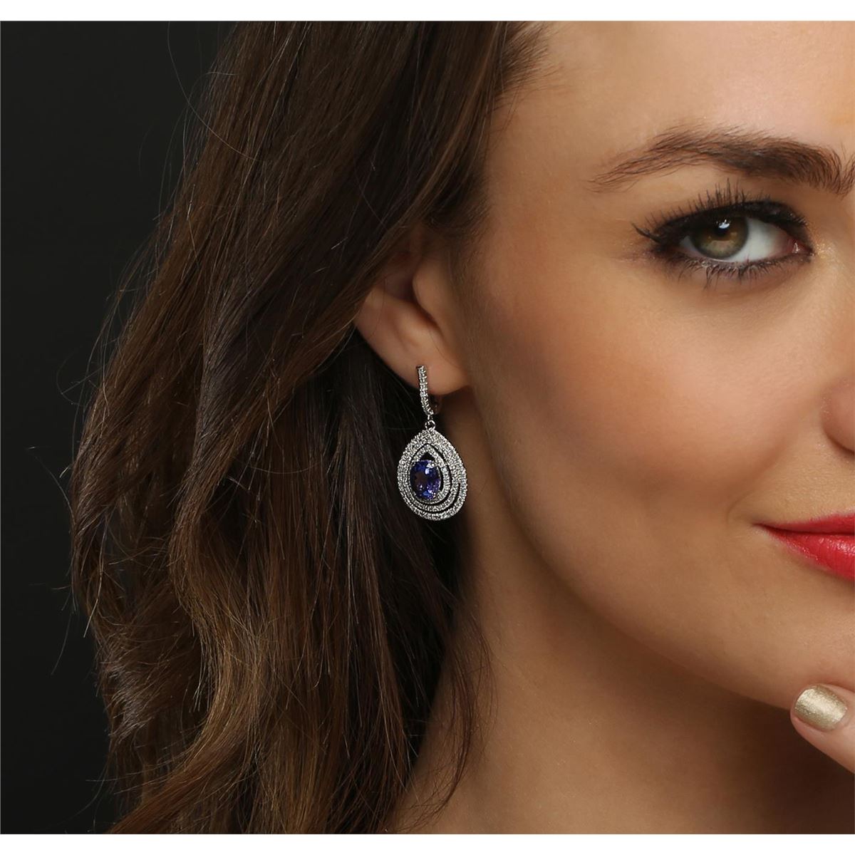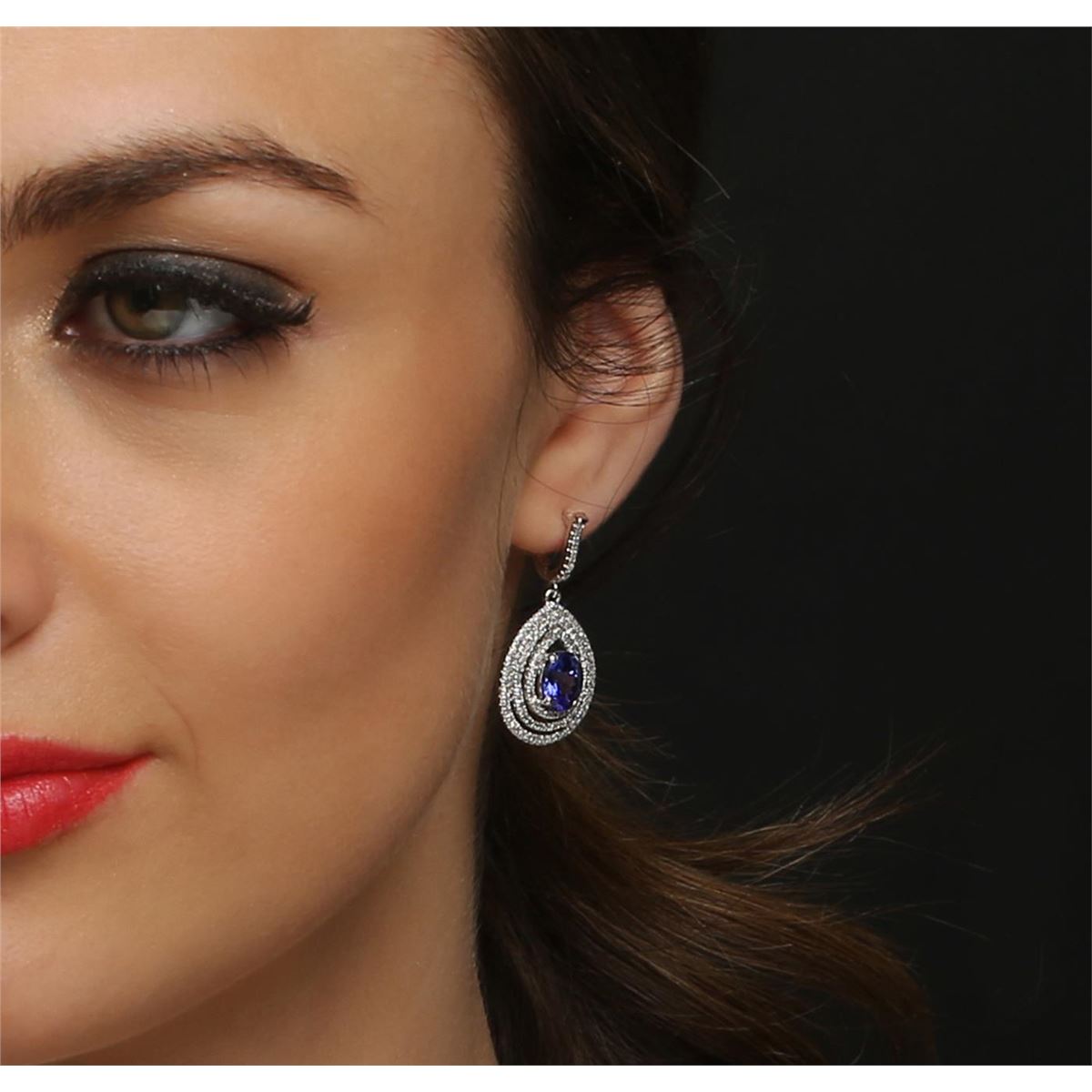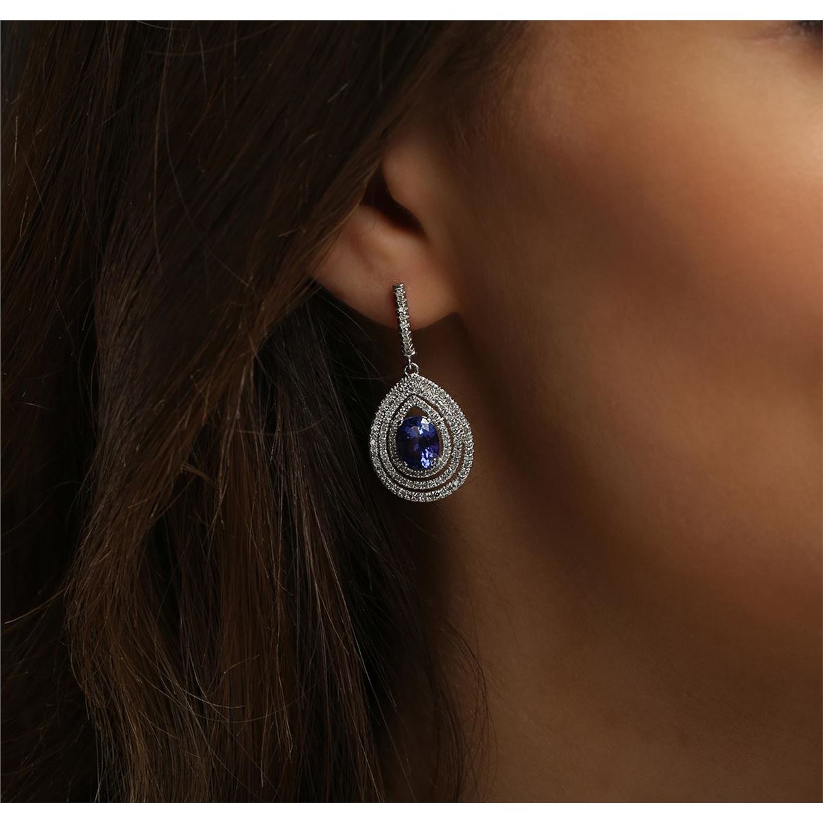 One pair electronically tested 14KT white gold ladies combination cast & assembled dangle earrings with hinged clip backs with a bright polish finish. Identified with markings of "585". Condition is new. Containing: Two prong set pear modified brilliant cut natural tanzanites, measuring 8.45 x 6.65 x 5.12mm, approximate total weight of 3.86ct., clarity is eye clean, type I, medium light, moderately strong, bluish violet color, (GIA bV 4/4), cut is good. Two Hundred Twenty-Six prong set round brilliant cut diamonds, measuring 1.20 - 1.20 x 0.72mm (depth est.) approximate total weight of 226 Stones = 1.42ct. Clarity: I-2 to I-3. Color: H - I, Cut is Good. Colored gemstones are presumed to have been subjected to commonly used enhancement processes. All diamonds and colored gemstones are graded in the mounting, unless otherwise stated. Total Weight of Colored Stones 3.86ct. Total Weight of Diamonds 1.42ct. Total Weight of Earrings 7.90 grams. GGL Appraised at $10,145.00.