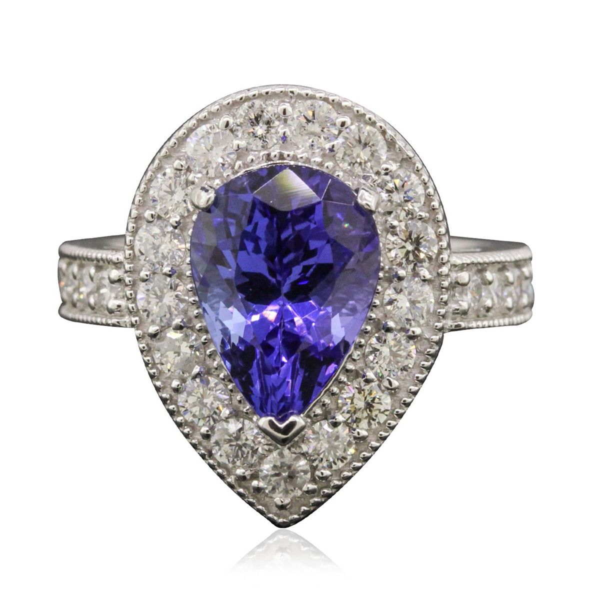 One electronically tested 14KT white gold ladies combination cast & assembled ring with a bright polish finish. Condition is new. Identified with markings of "K14". Containing: One prong set pear modified brilliant cut natural tanzanite, measuring 10.80 x 8.10 x 6.60mm, approximate weight of 3.87ct., clarity is eye clean, type I, medium, moderately strong, bluish violet color, (GIA bV 5/4), cut is good. Twenty-Seven prong set round brilliant cut diamonds, measuring 2.10 - 2.10 x 1.26mm (depth est.) approximate. Total Weight of 27 Stones = 0.92ct. Clarity: SI-1 to I-1. Color: H - I, Cut is Good. Colored gemstones are presumed to have been subjected to commonly used enhancement processes. All diamonds and colored gemstones are graded in the mounting, unless otherwise stated. Total Weight of Colored Stones 3.87ct. Total Weight of Diamonds 0.92ct. Total Weight of Ring 7.60 grams. GGL Appraised at $10,045.00.