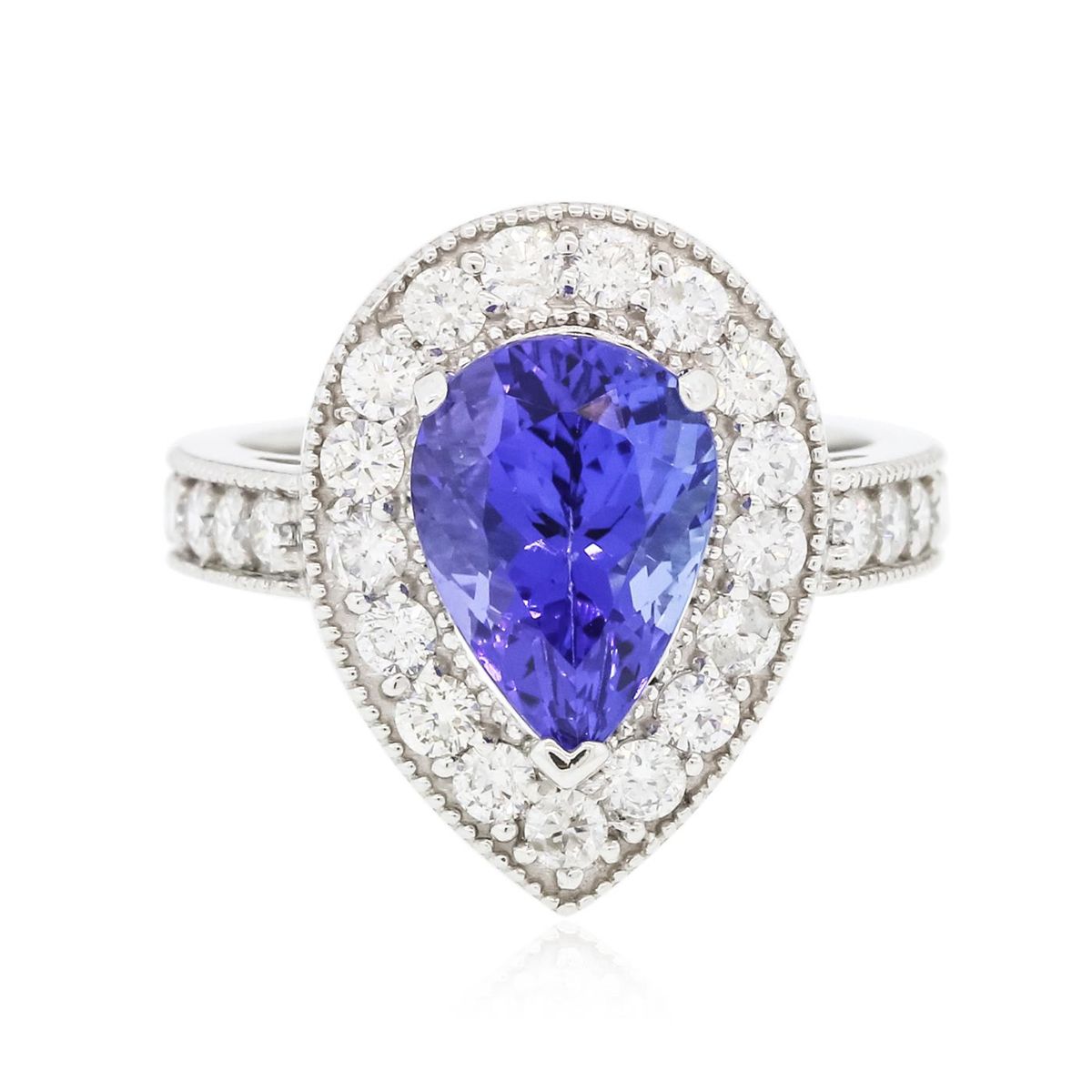 One electronically tested 14KT white gold ladies combination cast & assembled ring with a bright polish finish. Condition is new. Identified with markings of "K14". Containing: One prong set pear modified brilliant cut natural tanzanite, measuring 10.80 x 8.10 x 6.60mm, approximate weight of 3.87ct., clarity is eye clean, type I, medium, moderately strong, bluish violet color, (GIA bV 5/4), cut is good. Twenty-Seven prong set round brilliant cut diamonds, measuring 2.10 - 2.10 x 1.26mm (depth est.) approximate. Total Weight of 27 Stones = 0.92ct. Clarity: SI-1 to I-1. Color: H - I, Cut is Good. Colored gemstones are presumed to have been subjected to commonly used enhancement processes. All diamonds and colored gemstones are graded in the mounting, unless otherwise stated. Total Weight of Colored Stones 3.87ct. Total Weight of Diamonds 0.92ct. Total Weight of Ring 7.60 grams. GGL Appraised at $10,045.00.