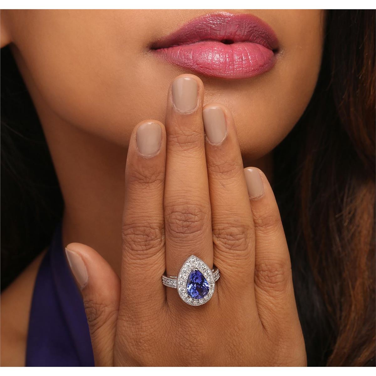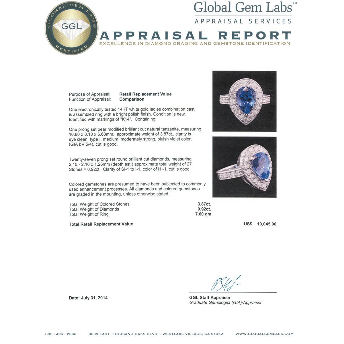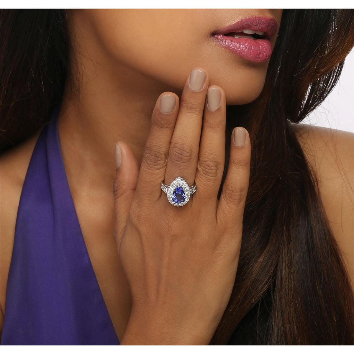 One electronically tested 14KT white gold ladies combination cast & assembled ring with a bright polish finish. Condition is new. Identified with markings of "K14". Containing: One prong set pear modified brilliant cut natural tanzanite, measuring 10.80 x 8.10 x 6.60mm, approximate weight of 3.87ct., clarity is eye clean, type I, medium, moderately strong, bluish violet color, (GIA bV 5/4), cut is good. Twenty-Seven prong set round brilliant cut diamonds, measuring 2.10 - 2.10 x 1.26mm (depth est.) approximate. Total Weight of 27 Stones = 0.92ct. Clarity: SI-1 to I-1. Color: H - I, Cut is Good. Colored gemstones are presumed to have been subjected to commonly used enhancement processes. All diamonds and colored gemstones are graded in the mounting, unless otherwise stated. Total Weight of Colored Stones 3.87ct. Total Weight of Diamonds 0.92ct. Total Weight of Ring 7.60 grams. GGL Appraised at $10,045.00.