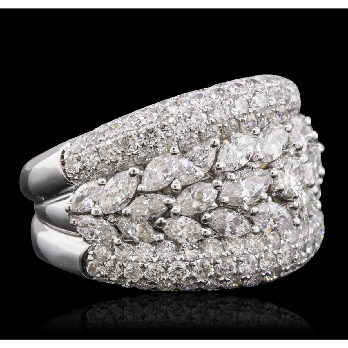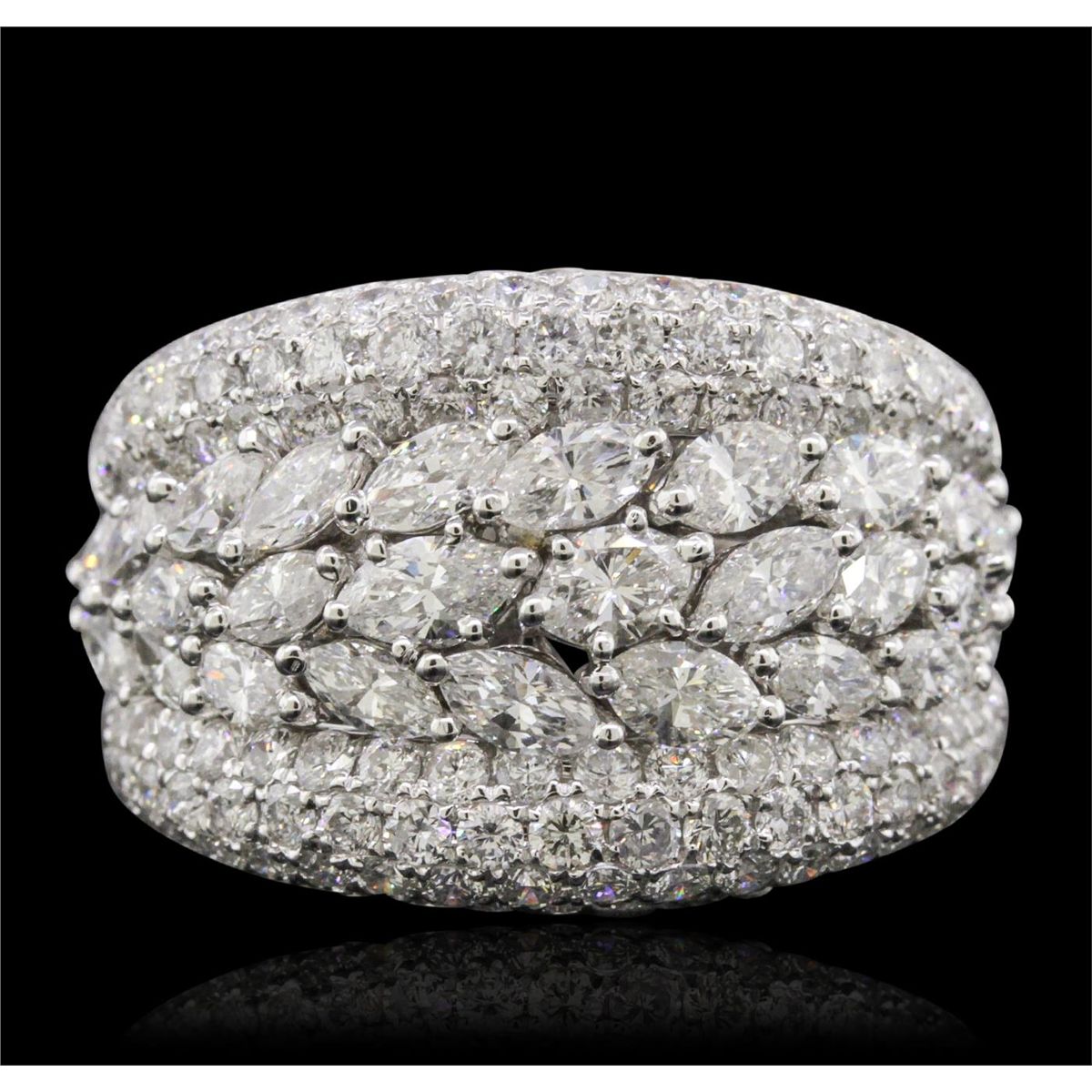 One electronically tested 14KT white gold ladies cast diamond ring with a tapered shank with a bright polish finish. Identified with markings of "14K". Condition is new. Containing: Twenty-Six prong set marquise shaped cut diamonds, measuring 4.00 x 2.20 x 1.39mm (depth est.) approximate total weight of 26 Stones = 2.10ct. Clarity: SI-1. Color: G - H, Cut is Good. One Hundred Forty-Four prong set round brilliant cut diamonds, measuring 1.50 - 1.50 x 0.90mm (depth est.) approximate total weight of 144 Stones = 1.77ct. Clarity: SI-2 to I-1. Color: H - I, Cut is Good. All diamonds are graded in the mounting, unless otherwise stated. Total Weight of Diamonds 3.87ct. Total Weight of Ring 9.00 grams. GGL Appraised at $14,835.00.