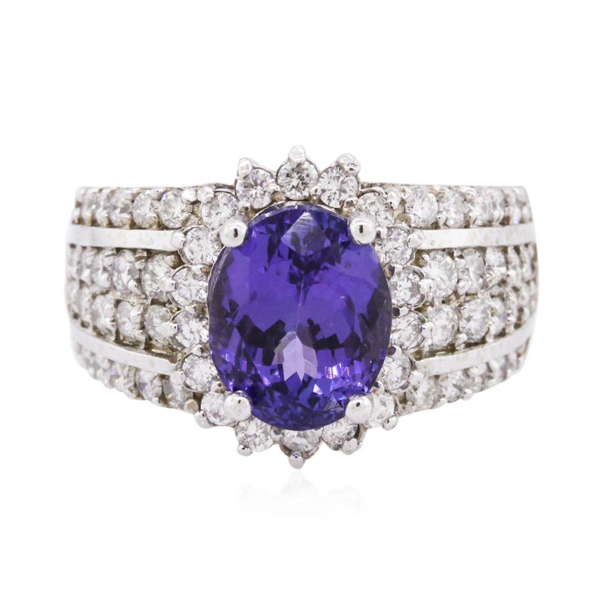 One electronically tested 14KT white gold ladies combination cast & assembled tanzanite and diamond ring with a flat shank with a bright polish finish. Identified with markings of "K14". Condition is new. Containing: One prong set oval modified brilliant cut natural tanzanite, measuring 10.08 x 8.10 x 7.00mm, approximate weight of 3.88ct., clarity is eye clean, type I, medium, moderately strong, violet color, (GIA V 5/4), cut is good. Fifty-Eight prong set round brilliant cut diamonds, measuring 1.90 - 1.80 x 1.11mm (depth est.) approximate total weight of 58 Stones = 1.34ct. Clarity: I-1 to I-2. Color: I - J, Cut is Good. Colored gemstones are presumed to have been subjected to commonly used enhancement processes. All diamonds and colored gemstones are graded in the mounting, unless otherwise stated. Total Weight of Colored Stones 3.88ct. Total Weight of Diamonds 1.34ct. Total Weight of Ring 10.90 grams. GGL Appraised at $10,745.00.
