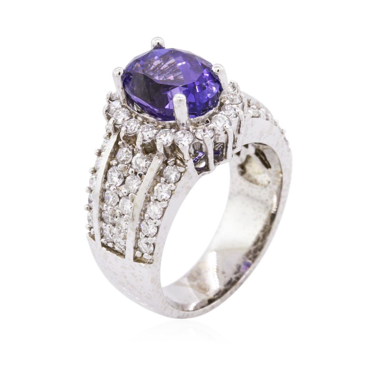 One electronically tested 14KT white gold ladies combination cast & assembled tanzanite and diamond ring with a flat shank with a bright polish finish. Identified with markings of "K14". Condition is new. Containing: One prong set oval modified brilliant cut natural tanzanite, measuring 10.08 x 8.10 x 7.00mm, approximate weight of 3.88ct., clarity is eye clean, type I, medium, moderately strong, violet color, (GIA V 5/4), cut is good. Fifty-Eight prong set round brilliant cut diamonds, measuring 1.90 - 1.80 x 1.11mm (depth est.) approximate total weight of 58 Stones = 1.34ct. Clarity: I-1 to I-2. Color: I - J, Cut is Good. Colored gemstones are presumed to have been subjected to commonly used enhancement processes. All diamonds and colored gemstones are graded in the mounting, unless otherwise stated. Total Weight of Colored Stones 3.88ct. Total Weight of Diamonds 1.34ct. Total Weight of Ring 10.90 grams. GGL Appraised at $10,745.00.