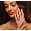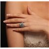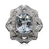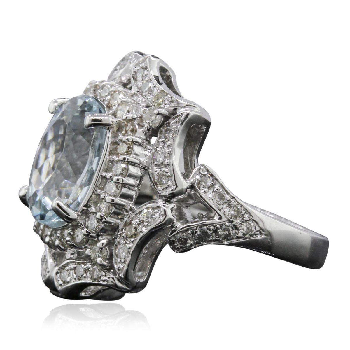 One electronically tested 14KT white gold ladies cast aquamarine and diamond ring with a bright polish finish. Condition is new, good workmanship. The featured aquamarine is set within a two tiered diamond lattice gallery, supported by diamond set split shoulders and completed by a two and one-half millimeter wide band. Identified with markings of "K14". Containing: One prong set oval mixed cut natural aquamarine, measuring 11.00 x 9.00 x 6.60mm, 8%. bulge factor, approximate weight of 3.88ct., clarity is eye clean, type I, medium light, very slightly grayish, very slightly greenish blue color, (GIA vslgB 4/3), cut is good. Transmitting light with no distortion, transparent. Refractive index testing results of 1.56 to 1.57. This is a conclusive result for Aquamarine (Beryl). Graded in the setting. Sixty-Two prong & bead set round brilliant cut diamonds, measuring 1.50 - 1.30 x 0.84mm (depth est.) approximate. Total Weight of 62 Stones = 0.72ct. Graded in the setting. Clarity: SI-2 to I-1. Color: J - L. Total Weight of Colored Stones 3.88ct. Total Weight of Diamonds 0.72ct. Total Weight of Ring 9.00 grams. AIG Appraised at $5,220.00.