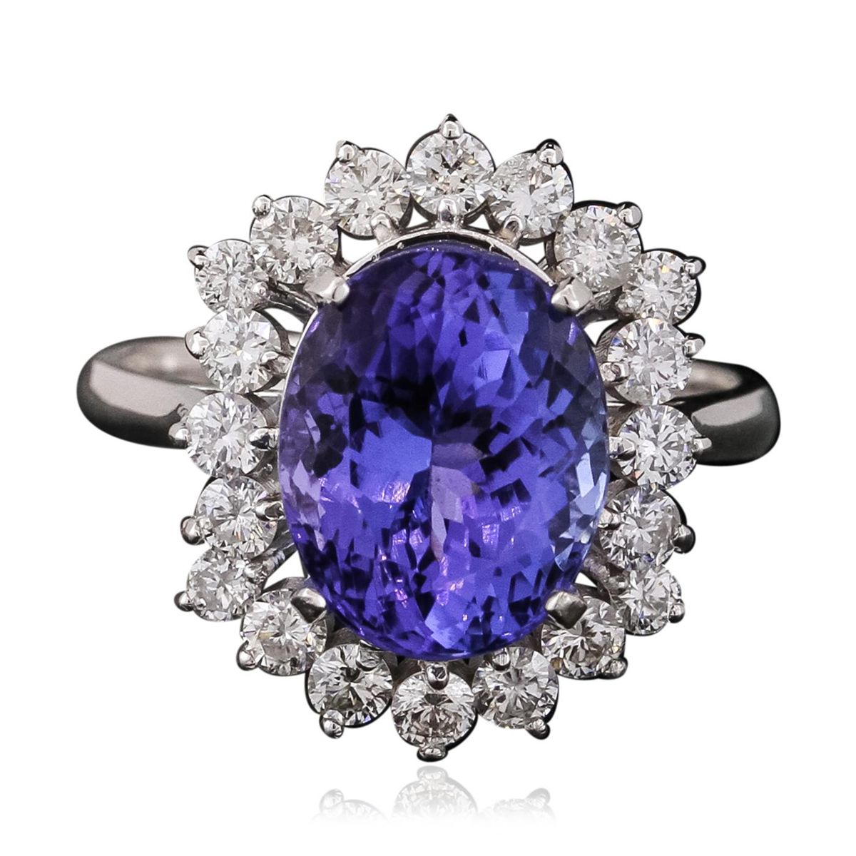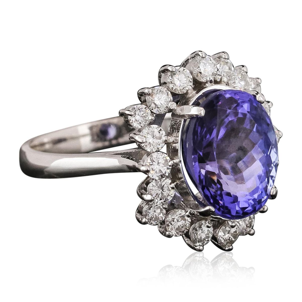 One electronically tested 14KT white gold ladies combination cast & assembled engagement ring with a bright polish finish. Identified with markings of "K14". Condition is new. Containing: One prong set oval modified brilliant cut natural tanzanite, measuring 11.10 x 8.90 x 5.79mm, approximate weight of 3.88ct., clarity is eye clean, type I, medium, moderately strong, bluish violet color, (GIA bV 5/4), cut is good. Twenty prong set round brilliant cut diamonds, measuring 2.20 - 1.80 x 1.20mm (depth est.) approximate total weight of 20 Stones = 0.58ct. Clarity: I-1. Color: I - J, Cut is Good. Colored gemstones are presumed to have been subjected to commonly used enhancement processes. All diamonds and colored gemstones are graded in the mounting, unless otherwise stated. Total Weight of Colored Stones 3.88ct. Total Weight of Diamonds 0.58ct. Total Weight of Ring 5.10 grams. GGL Appraised at $8,915.00.