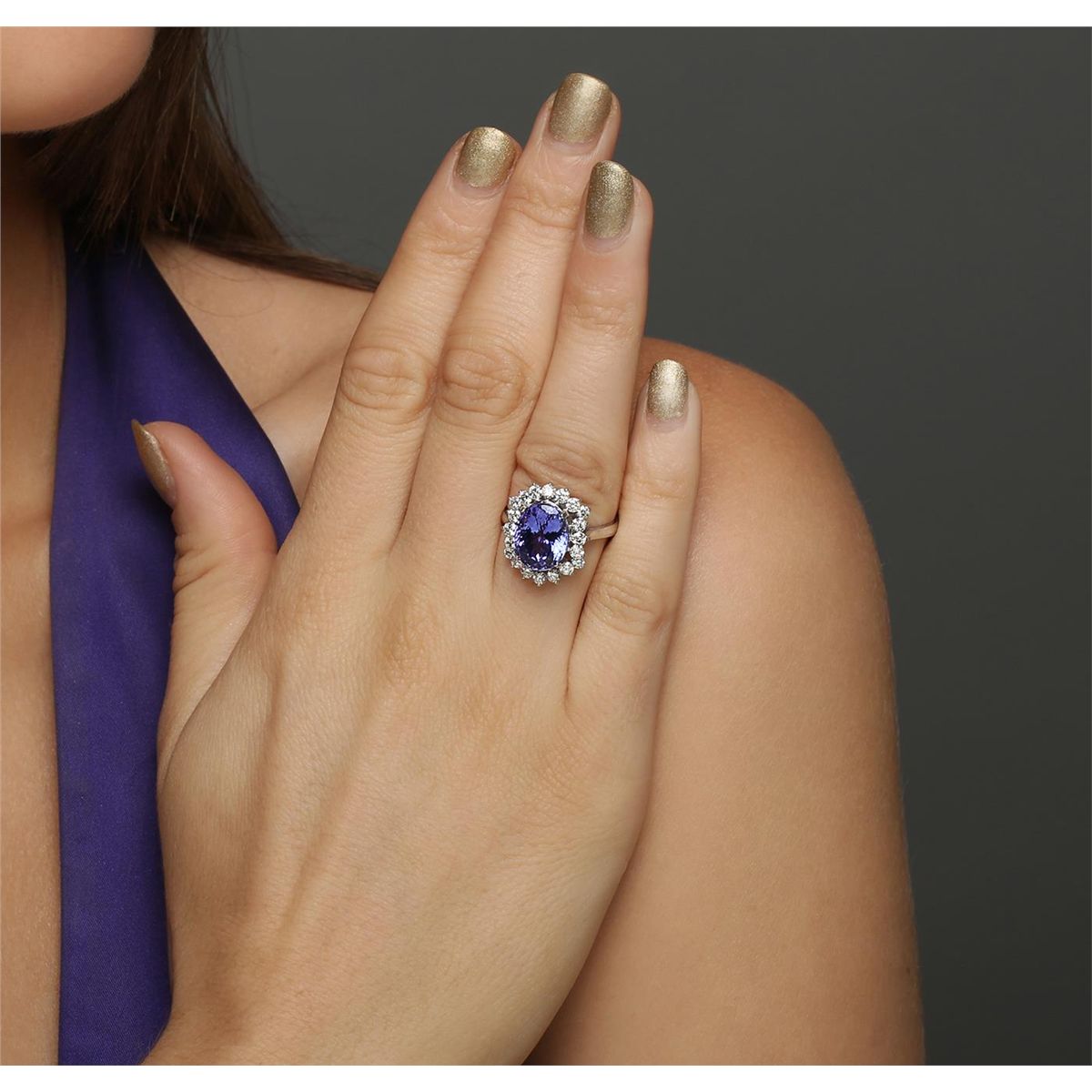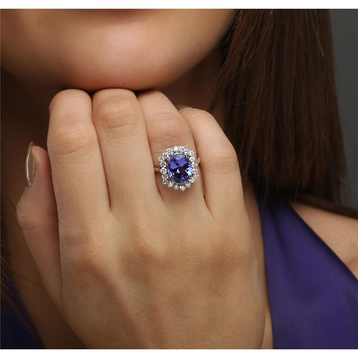One electronically tested 14KT white gold ladies combination cast & assembled engagement ring with a bright polish finish. Identified with markings of "K14". Condition is new. Containing: One prong set oval modified brilliant cut natural tanzanite, measuring 11.10 x 8.90 x 5.79mm, approximate weight of 3.88ct., clarity is eye clean, type I, medium, moderately strong, bluish violet color, (GIA bV 5/4), cut is good. Twenty prong set round brilliant cut diamonds, measuring 2.20 - 1.80 x 1.20mm (depth est.) approximate total weight of 20 Stones = 0.58ct. Clarity: I-1. Color: I - J, Cut is Good. Colored gemstones are presumed to have been subjected to commonly used enhancement processes. All diamonds and colored gemstones are graded in the mounting, unless otherwise stated. Total Weight of Colored Stones 3.88ct. Total Weight of Diamonds 0.58ct. Total Weight of Ring 5.10 grams. GGL Appraised at $8,915.00.