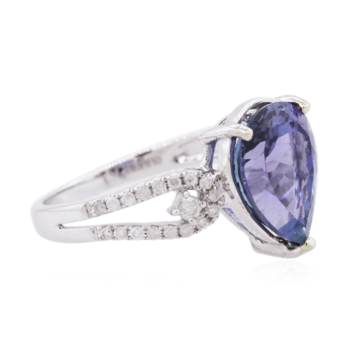 One electronically tested 14KT white gold ladies combination cast & assembled tanzanite and diamond ring with a split shank with a bright polish finish. Identified with markings of "14K". Condition is new. Containing: One prong set pear modified brilliant cut natural tanzanite, measuring 11.00 x 8.88 x 5.93mm, approximate weight of 3.88ct., clarity is eye clean, type I, medium, very slightly grayish, violet color, (GIA V 5/3), cut is good. Thirty-Six prong set round brilliant cut diamonds, measuring 1.50 - 1.20 x 0.81mm (depth est.) approximate total weight of 36 Stones = 0.20ct. Clarity: I-1 to I-2. Color: I - J, Cut is Good. Colored gemstones are presumed to have been subjected to commonly used enhancement processes. All diamonds and colored gemstones are graded in the mounting, unless otherwise stated. Total Weight of Colored Stones 3.88ct. Total Weight of Diamonds 0.20ct. Total Weight of Ring 3.30 grams. GGL Appraised at $6,895.00.